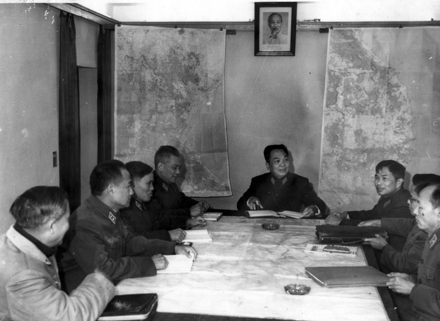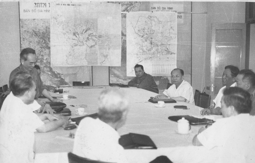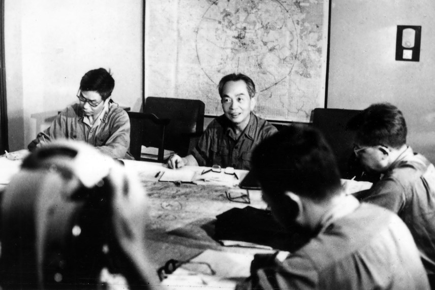 | Tại Tổng Hành dinh Đại tướng Võ Nguyên Giáp cùng các đồng chí trong Quân ủy Trung ương theo dõi, nắm bắt từng bước diễn biến rất nhanh của các mặt trận, luôn kịp thời đưa ra những chỉ đạo phù hợp cho các hướng tấn công. Nguồn: daidoanket.vn |