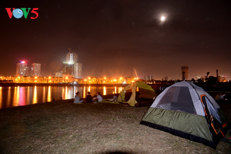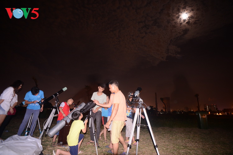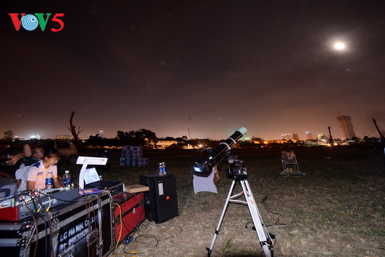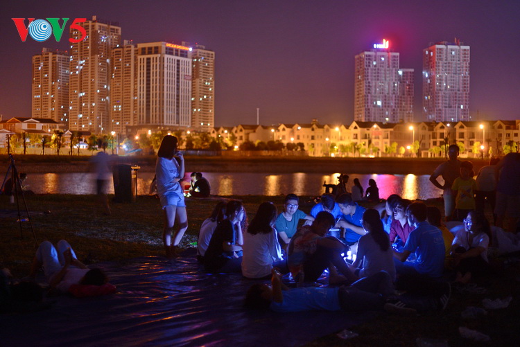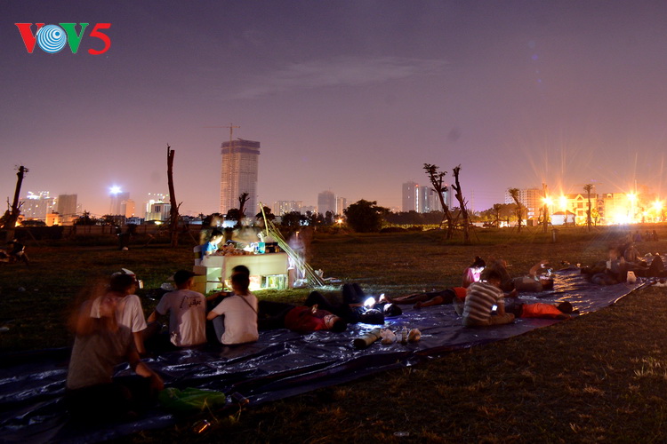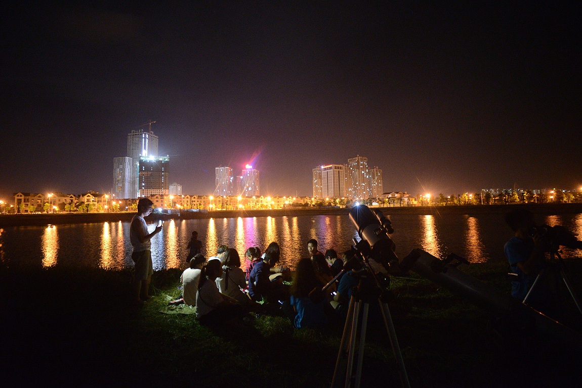 | Tại khu đô thị Dương Nội (Hà Đông- Hà Nội), nhóm các bạn trẻ yêu thiên văn còn tổ chức hoạt động dã ngoại ngắm trăng sao ngoài trời |