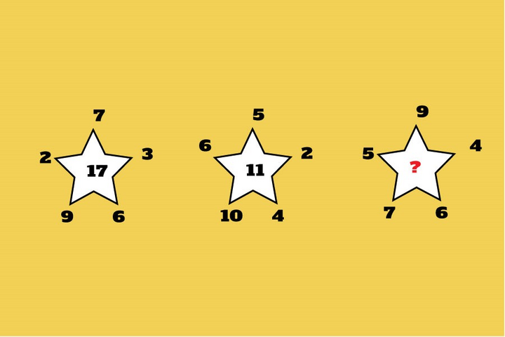 Dựa vào các dữ kiện có sẵn, hãy tìm ra số còn thiếu trong ngôi sao thứ ba dưới đây. Để tìm ra đáp án trong thời gian ngắn, người làm phải có tư duy logic và khả năng tính toán nhanh nhạy. Được biết, đây là dạng toán không dễ chinh phục, thường xuất hiện trong các bài kiểm tra IQ.