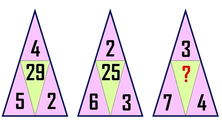 Quan sát ba hình tam giác trong bức hình, mỗi tam giác gồm ba số ở các cạnh và một số nằm ở trung tâm. Hai hình đầu tiên cho thấy mối liên hệ logic giữa các con số xung quanh và số ở giữa.