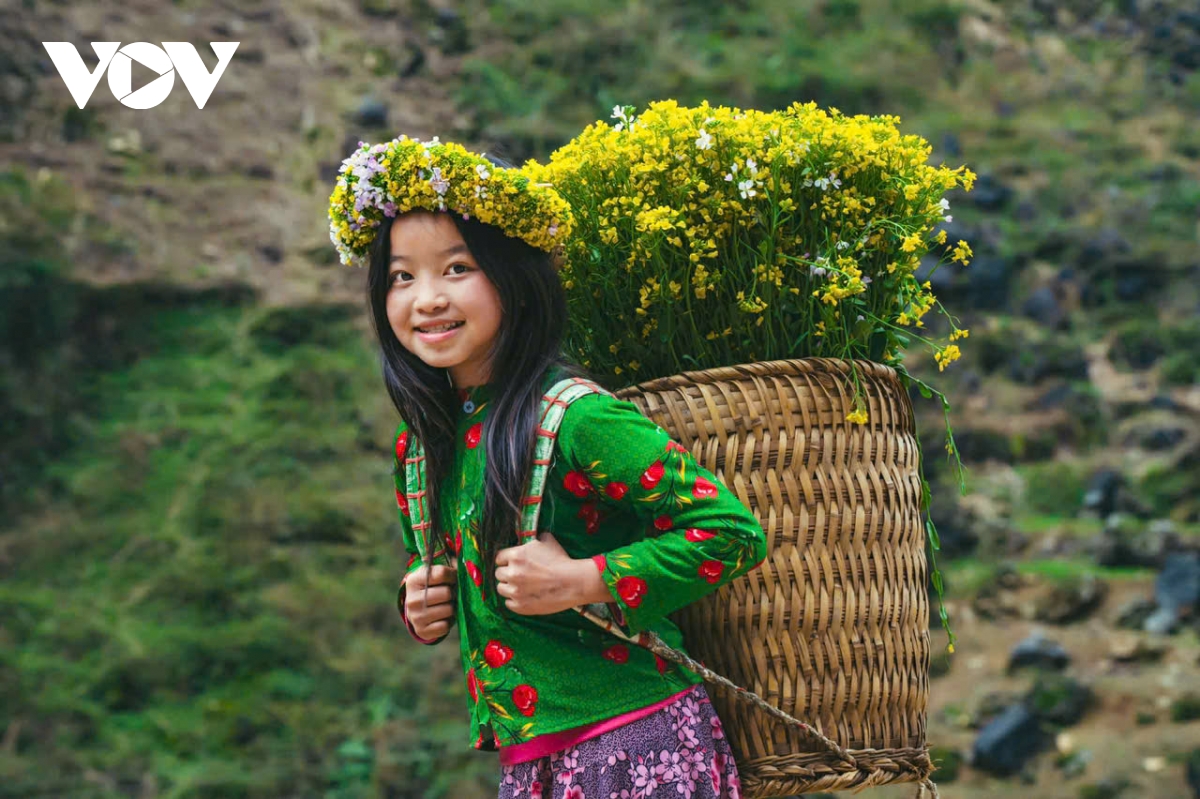| Những đứa trẻ với đôi má ửng hồng vì nẻ lạnh, khoác lên mình những bộ váy áo sặc sỡ như những cánh bướm mùa xuân. Chúng gùi sau lưng không phải là gánh nặng mưu sinh, mà là những gùi hoa cải vàng rực, hoa tam giác mạch li ti. Tiếng cười của trẻ nhỏ làm tan chảy cái lạnh cắt da cắt thịt của vùng biên viễn. |