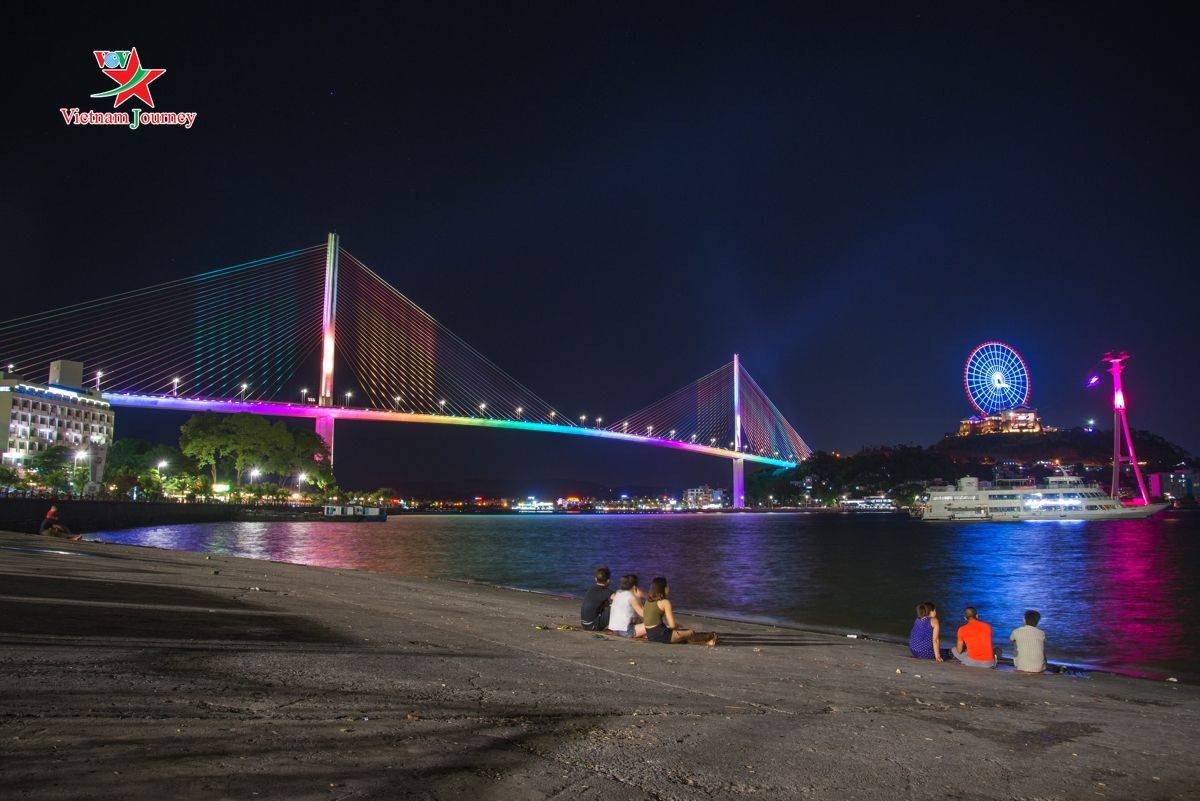 Rực rỡ và ấn tượng nhất phải kể đến cầu Bãi Cháy – một trong những biểu tượng của thành phố. Hệ thống chiếu sáng bằng đèn LED tiết kiệm năng lượng tạo nên các dải màu liên tục thay đổi trên dây văng như những màn trình diễn “vũ điệu” ánh sáng.