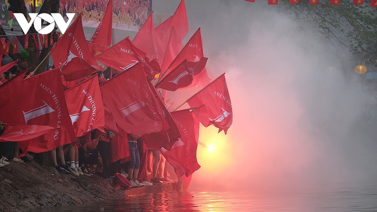 Người dân cuồng nhiệt cổ vũ các đội thi từ hai bên bờ sông Pheo. |