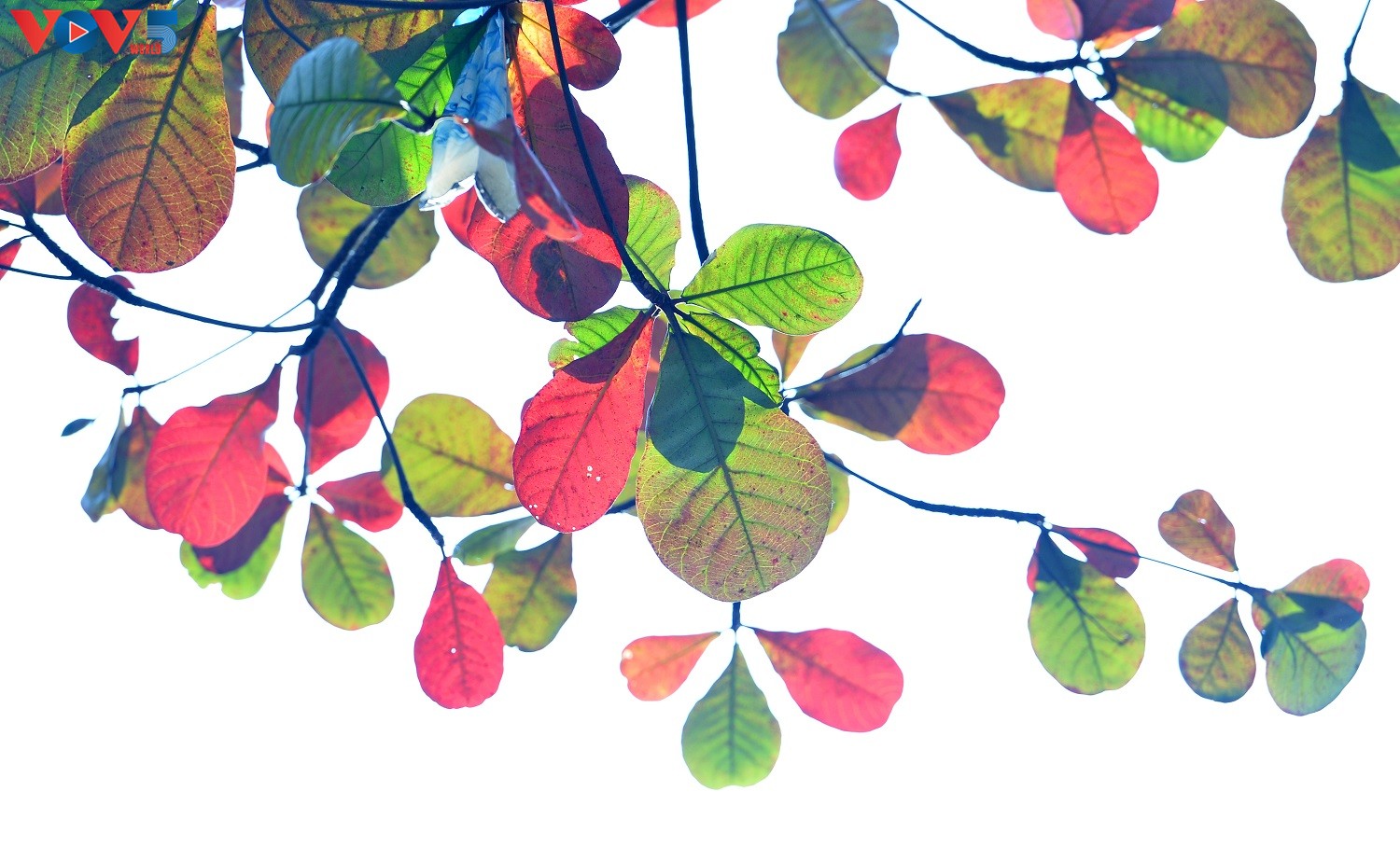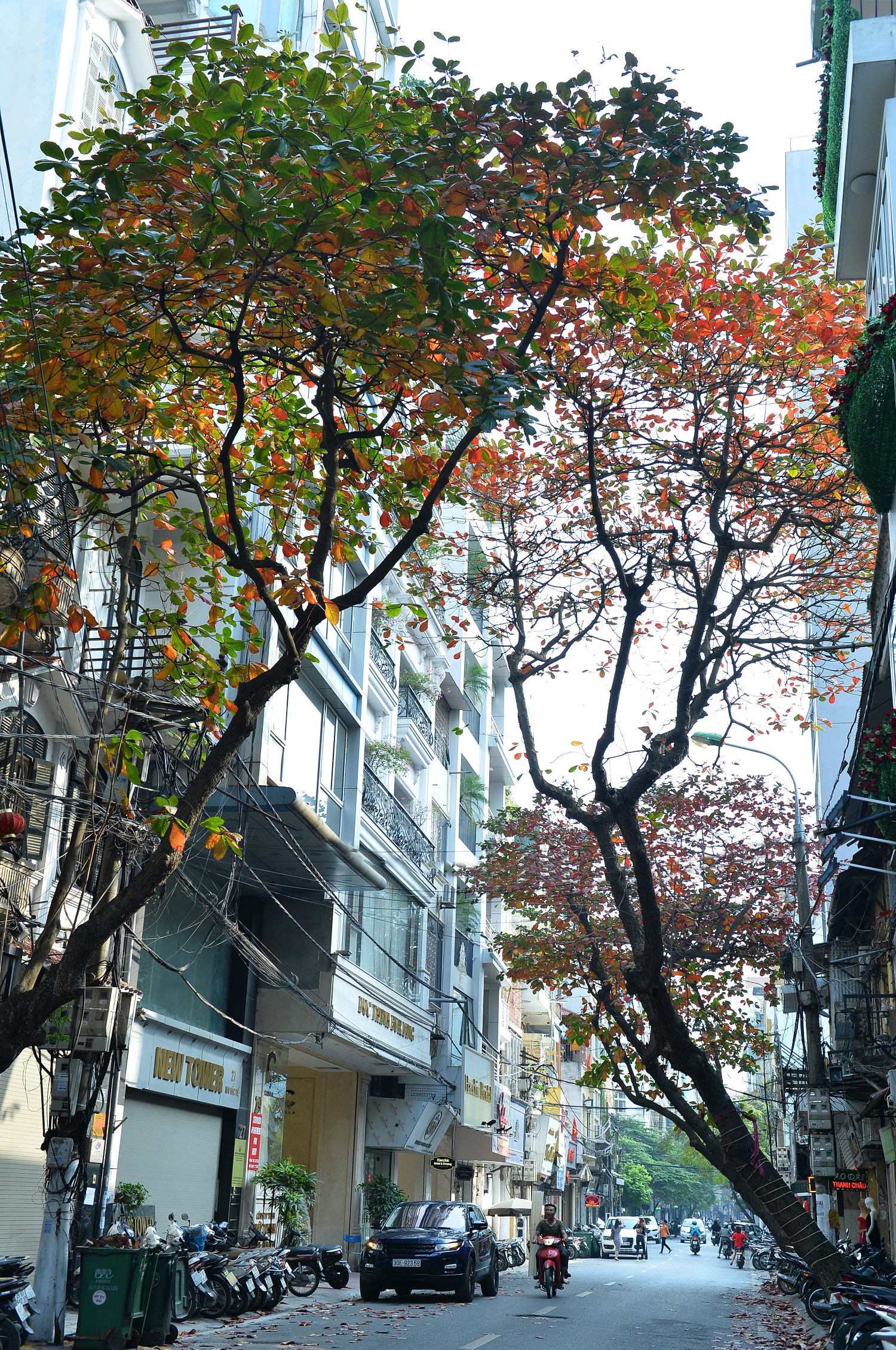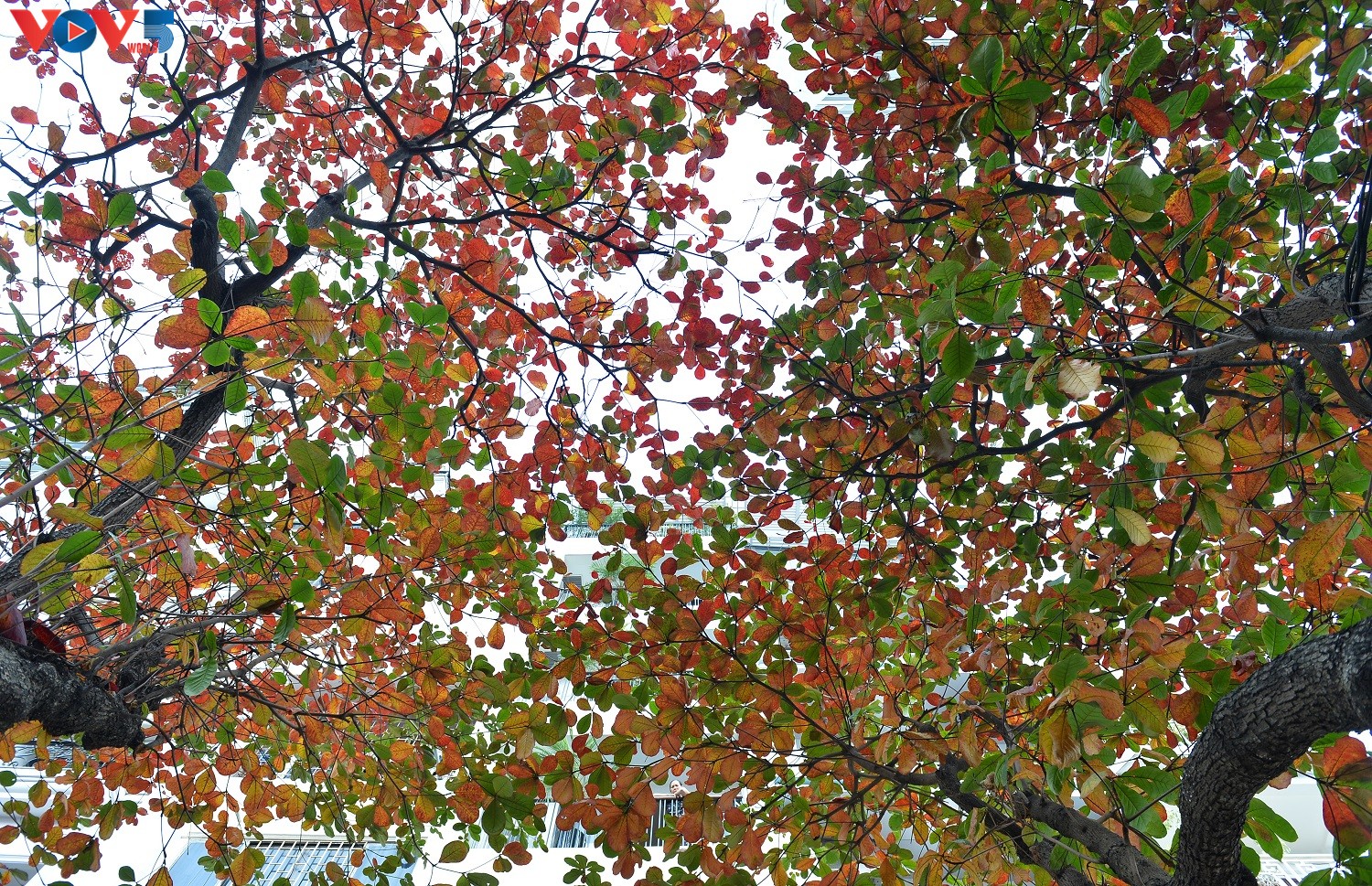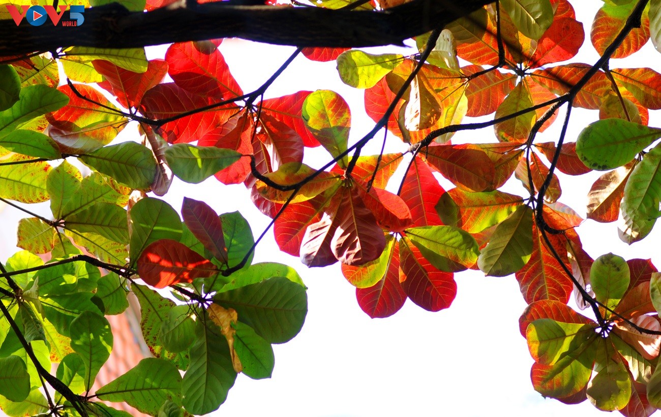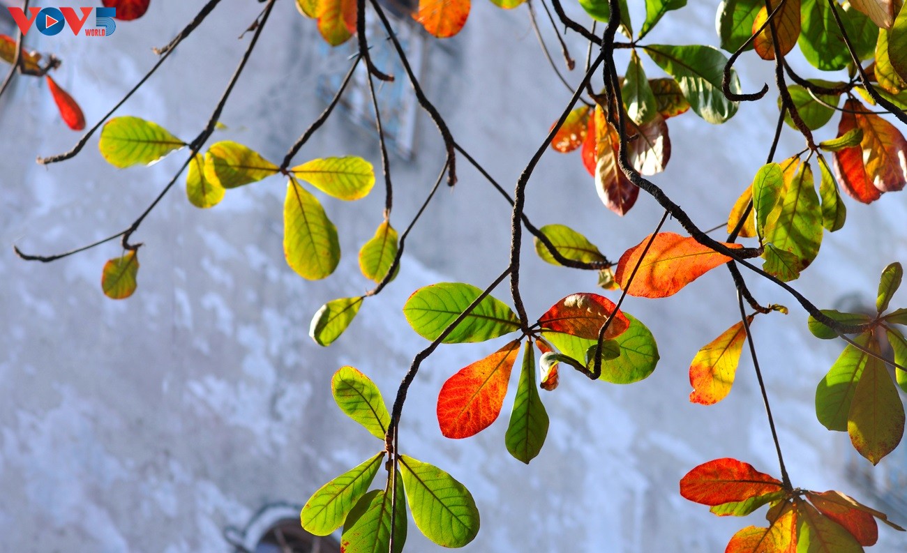 Tán bàng im lìm, lặng lẽ trong suốt mùa thu giờ bỗng cựa mình bung đủ sắc màu.