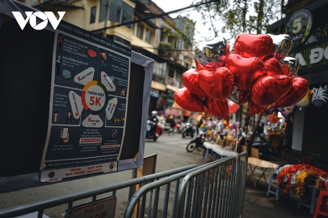Một góc phố Hà Nội với thông điệp 5K phòng chống đại dịch COVID-19. Những ngày giáp Tết, phố phường Thủ đô thường nhộn nhịp, tấp nập nhưng năm nay, do dịch bệnh nên quang cảnh trầm lắng và vắng vẻ hơn.