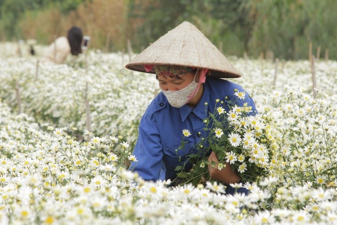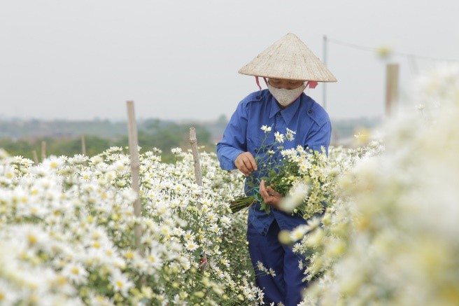 | Người dân tiếp tục thu hoạch cúc họa my tại vườn hoa Nhật Tân |