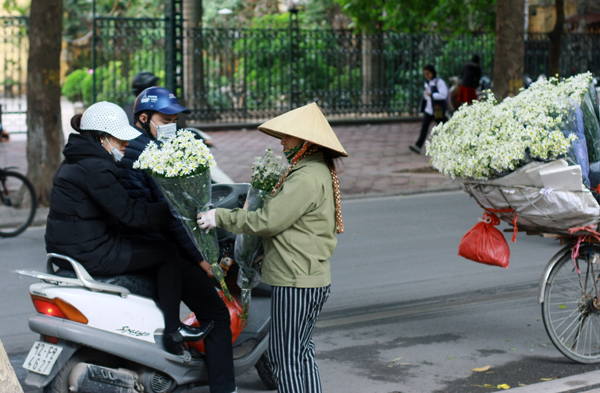 | Đường phố rét buốt, nhưng người đi đường vẫn dừng lại chọn cho mình những bó cúc họa mi hay chụp ảnh lưu niệm với loài hoa xinh đẹp này |