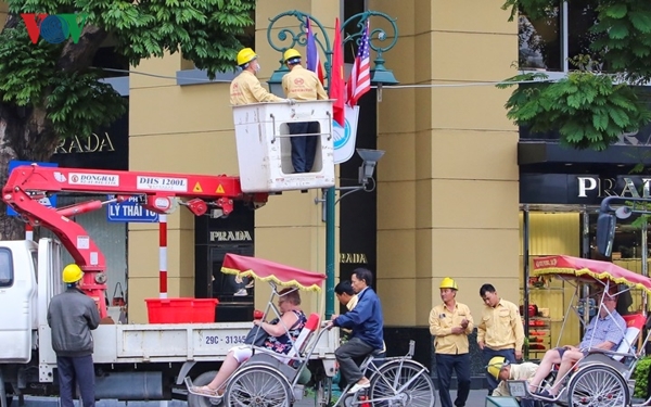 | Cờ Triều Tiên và Hoa Kỳ được treo dọc hai bên cầu vượt An Dương, Tây Hồ, Hà Nội. (VTC) |