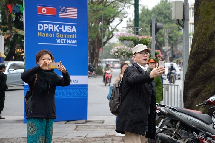 | Các du khách Hàn Quốc thích thú chụp lại hình ảnh chuẩn bị mọi mặt cho Thượng đỉnh Hoa Kỳ - Triều Tiên lần thứ 2. (Trung Hiếu/VOV.VN) |