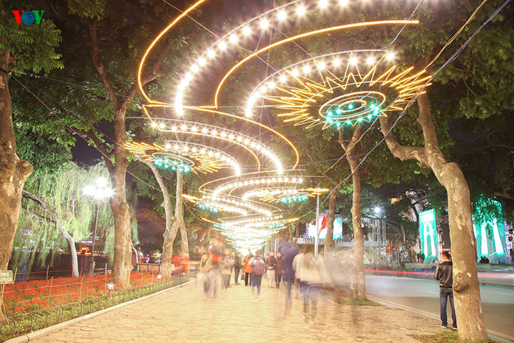 | Đi bộ xung quanh hồ Gươm, chúng ta có thể ngắm nhìn những hàng đèn led đầy màu sắc. |