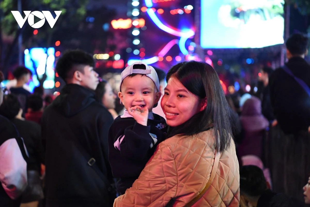 Nhiều gia đình đi theo nhóm, có người đưa con nhỏ, có người đi cùng bố mẹ lớn tuổi, cùng chờ đợi giây phút đầu tiên của năm mới trong tiếng đếm ngược và những lời chúc vang lên rộn ràng.