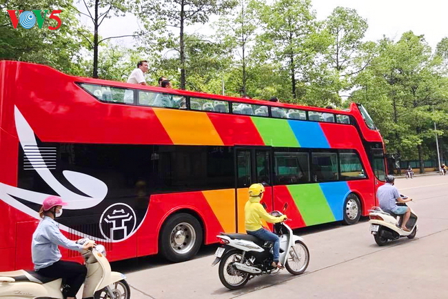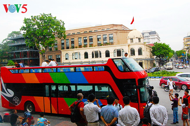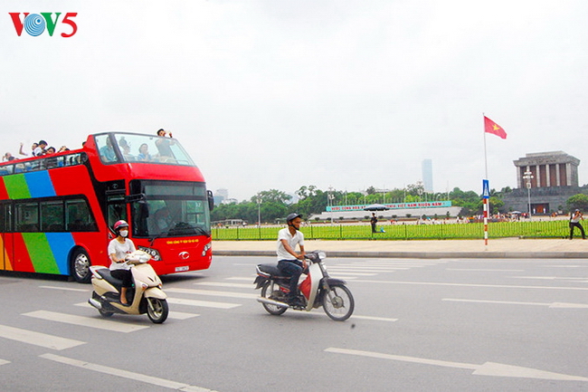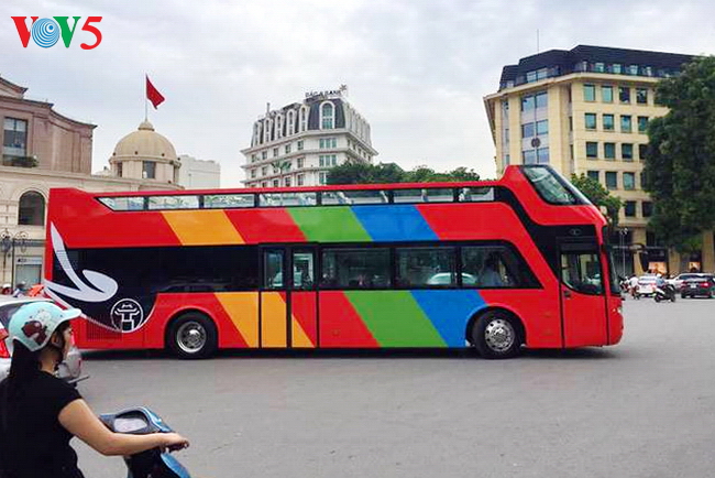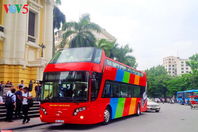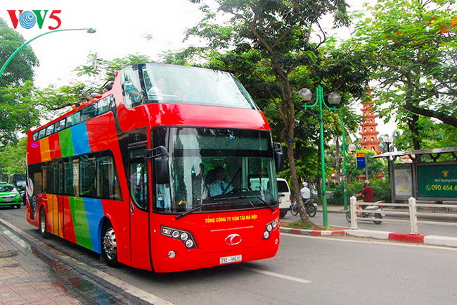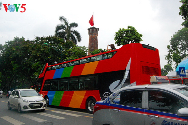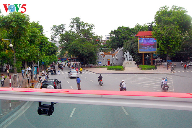 | Xe bus chạy qua Cột cờ Hà Nội |