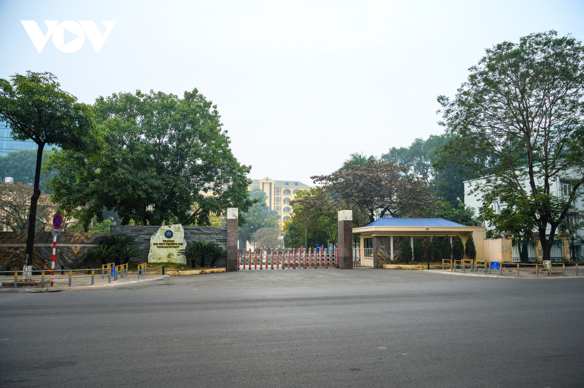 Cổng trường Đại học Thương mại không bóng sinh viên, không quán trà đá vỉa hè nhộn nhịp như ngày thường |