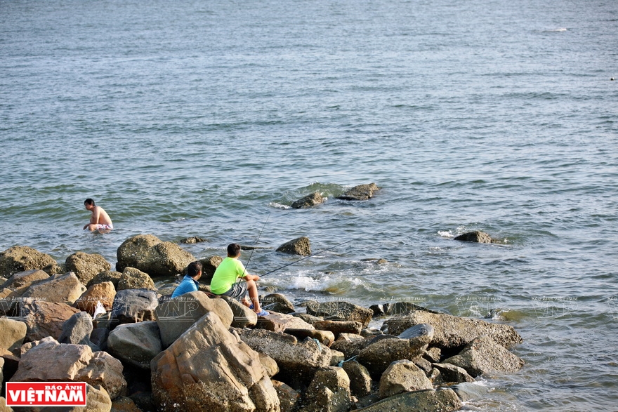 Du khách câu cá giải trí trên những ghềnh đá dọc Bãi Dứa. Ảnh: TTXVN