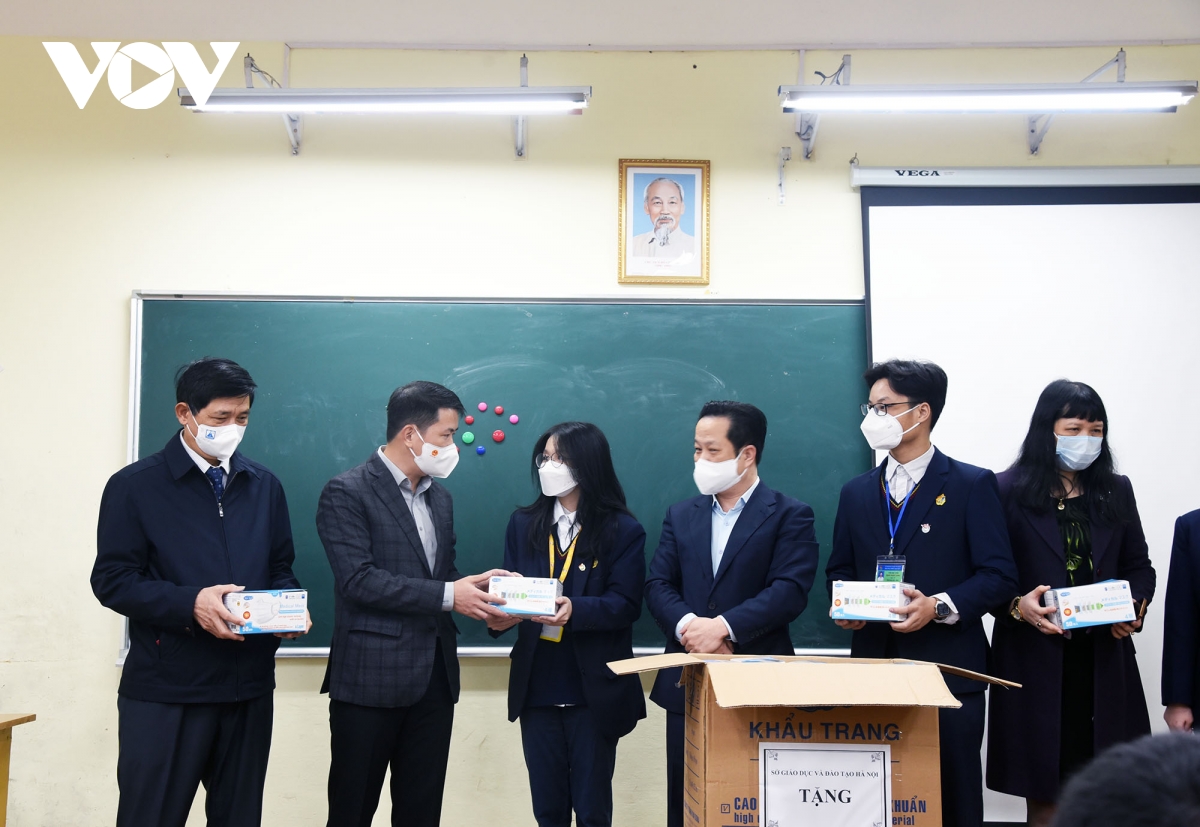 Trong buổi học đầu tiên, đoàn kiểm tra của Sở GD-ĐT Hà Nội cũng tặng khẩu trang cho học sinh lớp 12 trường THPT Việt Đức. |