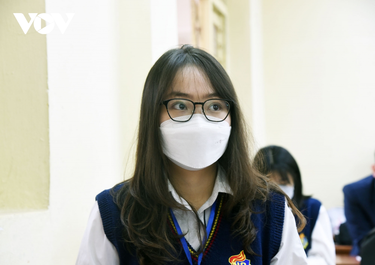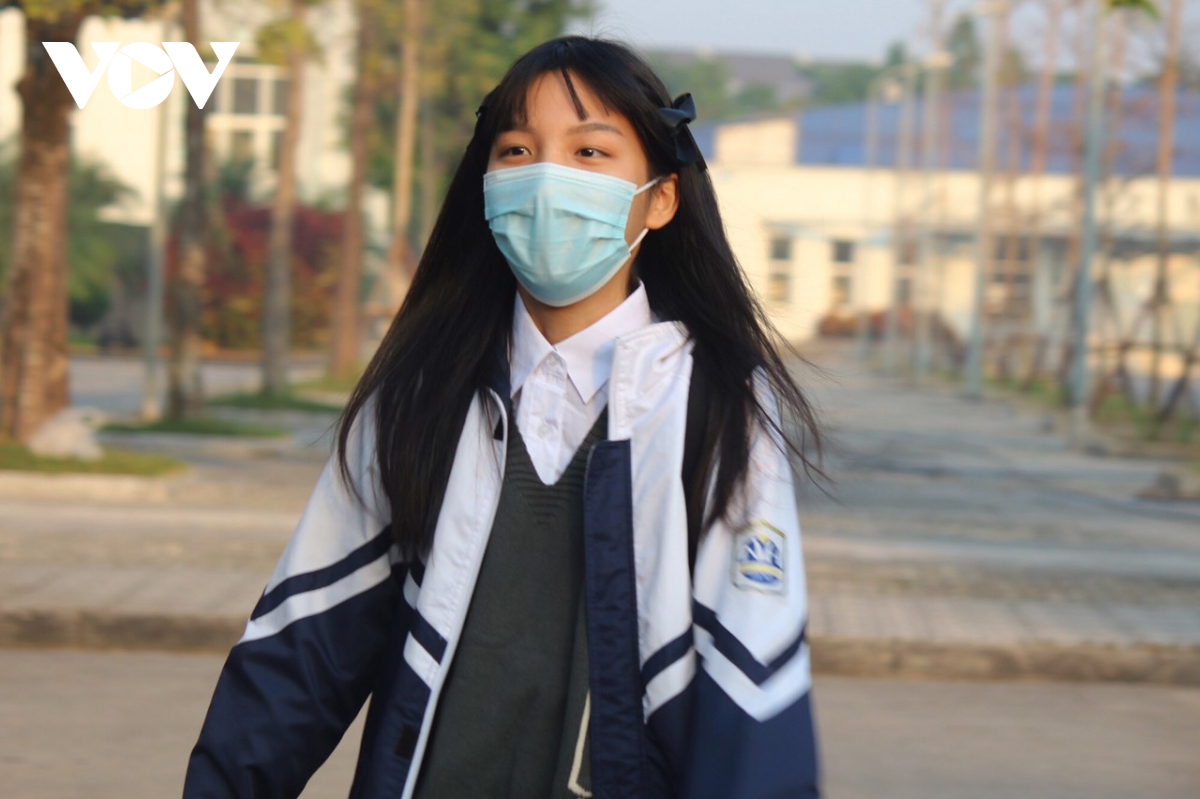 Em Hoàng Nguyễn Nhật Phương, học lớp 12 Sử, trường THPT Nguyễn Huệ chia sẻ: "Em rất hồi hộp và cũng rất vui mừng khi được quay trở lại trường, vì thế em đã dậy rất sớm để chuẩn bị cho ngày học đầu tiên. Tuy nhiên em cũng có chút lo sợ bởi vì ca nhiễm trong cộng đồng khá cao trong những ngày gần đây". |