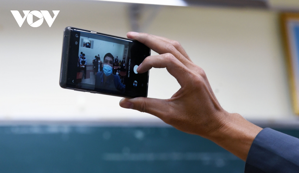 Thầy trò trường THPT Việt Đức cùng chụp ảnh selfie trong buổi học đầu tiên. |