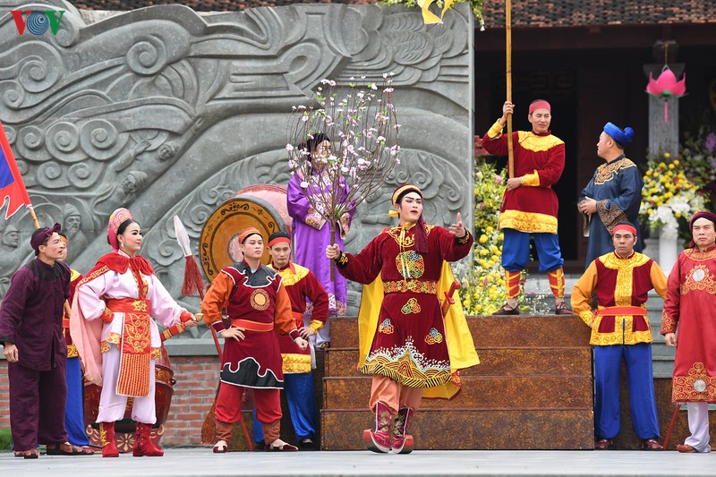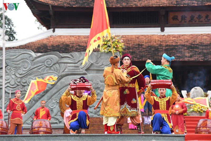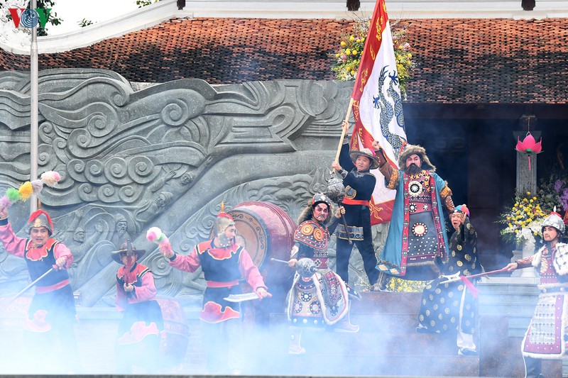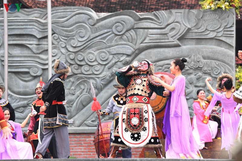 Hình tượng vua Quang Trung do diễn viên Nhà hát Tuồng Trung ương thể hiện trong màn trình diễn trước cửa Đền thờ vua Quang Trung.