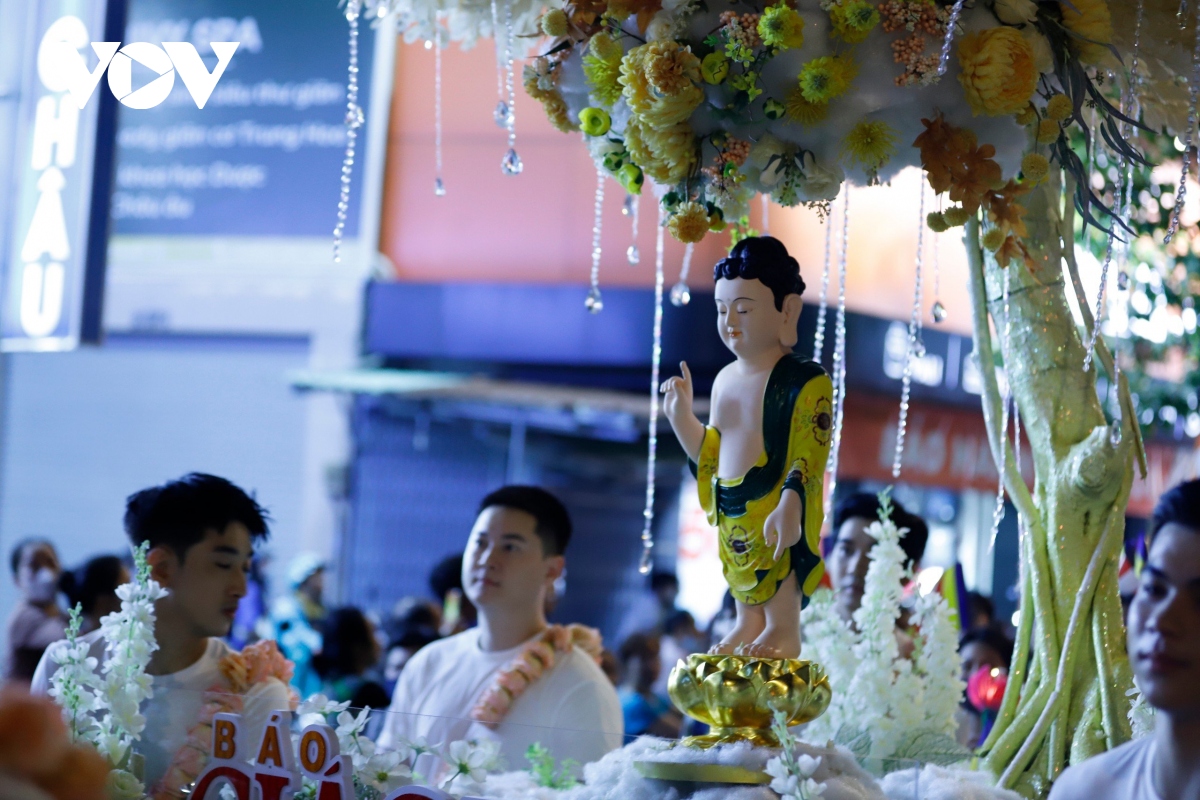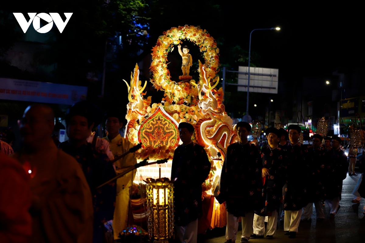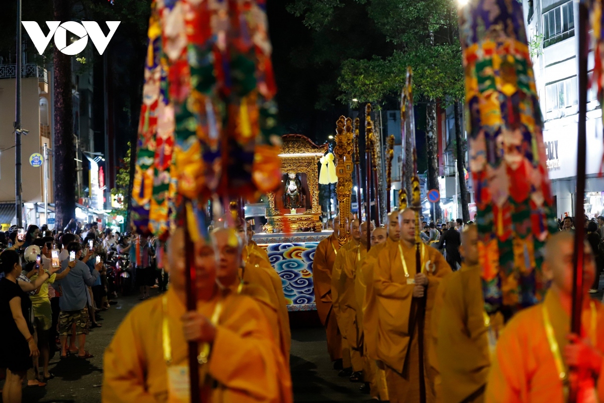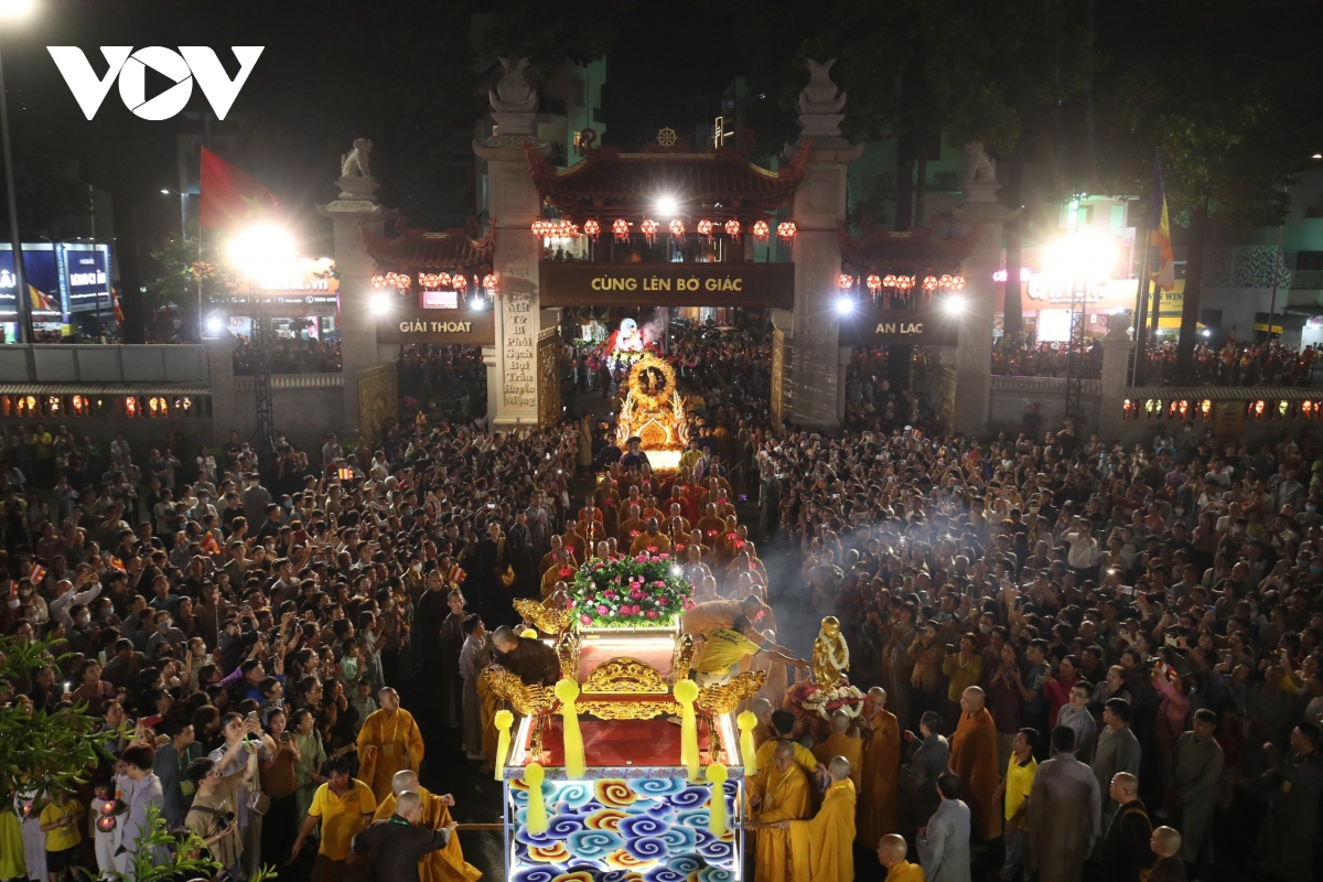 Đúng 20h, Lễ rước kiệu Phật được cử hành trang trọng, với hàng chục kiệu Phật của các ban ngành Giáo hội Phật giáo Việt Nam TP. Hồ Chí Minh cùng các cơ sở thờ tự thuộc các hệ phái khác nhau như: Phật giáo Bắc tông, Phật giáo Nam tông, Phật giáo Khất sĩ,... |