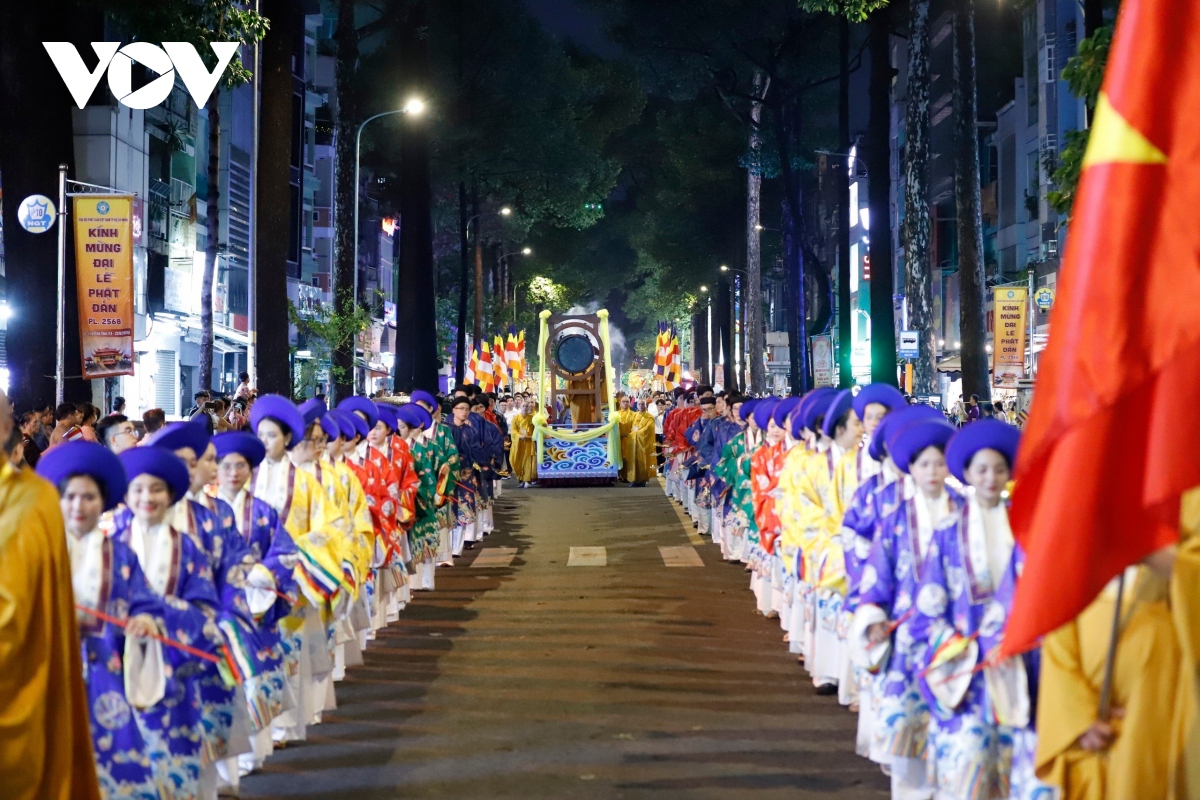 Đoàn rước kiệu Phật đản sinh khởi hành từ tổ đình Ấn Quang diễu hành qua các tuyến đường Sư Vạn Hạnh - Ngô Gia Tự - Lê Hồng Phong - đường 3/2 sau đó tập trung tại Việt Nam Quốc Tự. |