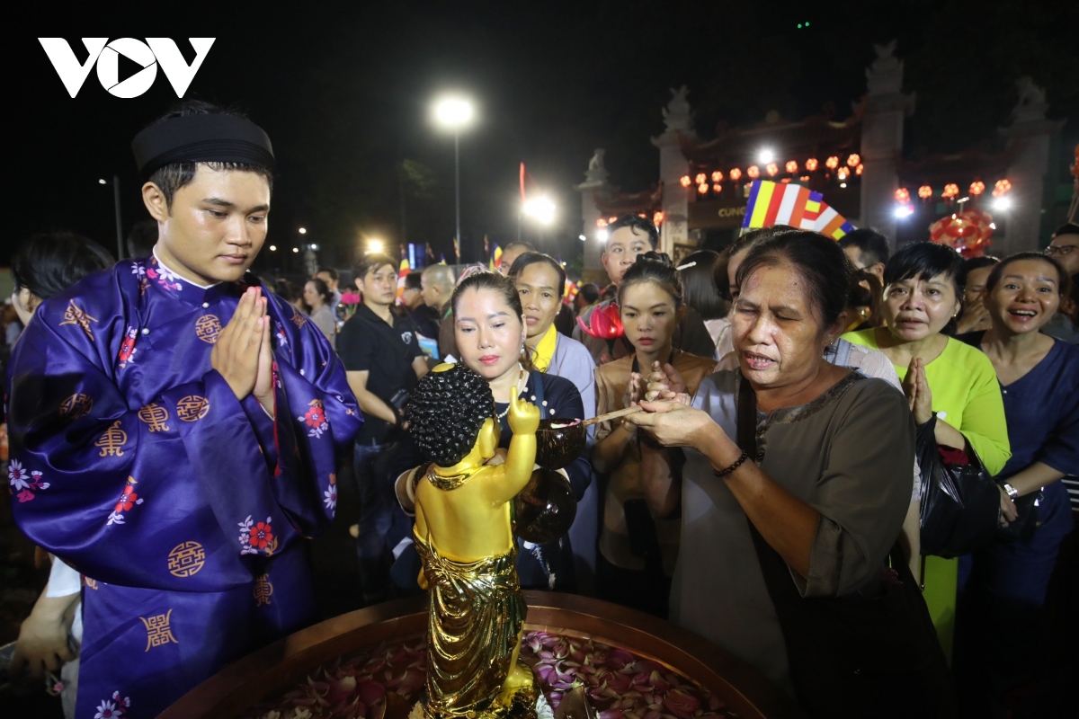 Hàng ngàn phật tử háo hức, lần lượt thực hiện nghi lễ tắm Phật. |