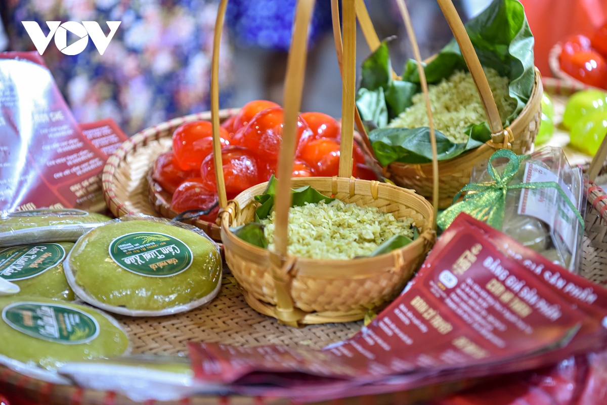 Khu vực trải nghiệm cốm và đặc sản Hà Nội thu hút đông đảo du khách. |