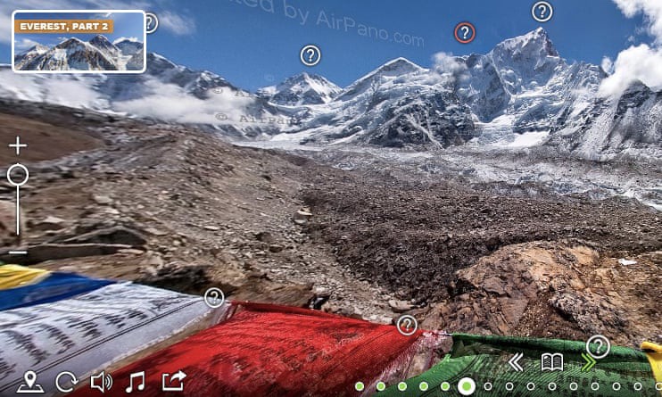 Núi Everest, Nepal: Nằm ở biên giới giữa Nepal và Trung Quốc. Thông qua bản đồ tương tác và trình xem xoay 3D, bạn có thể ngắm nhìn đỉnh núi cao 8,848 mét, cộng với các đỉnh núi khác của dãy Himalaya trải dài về phía tây vào Pakistan và phía đông đến Bhutan.