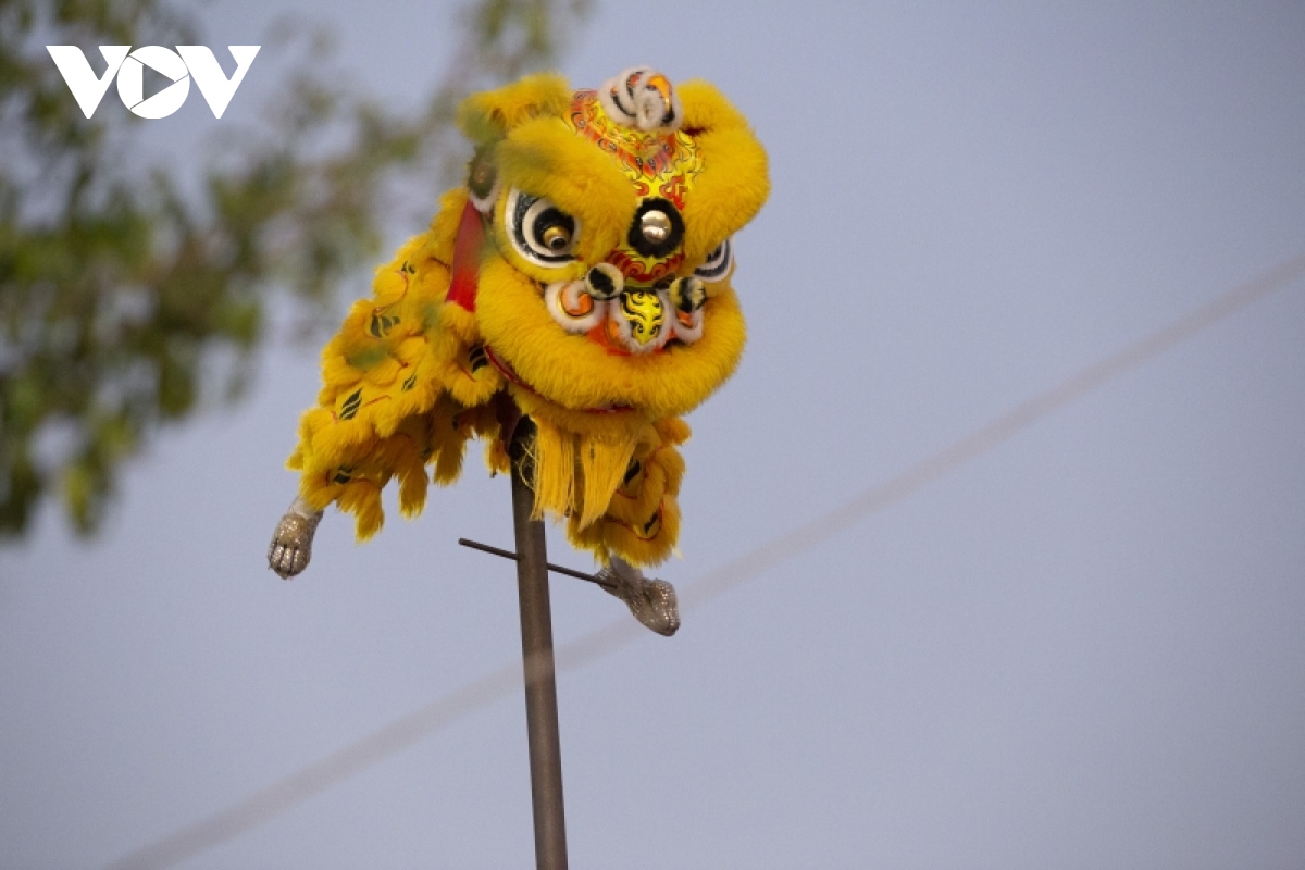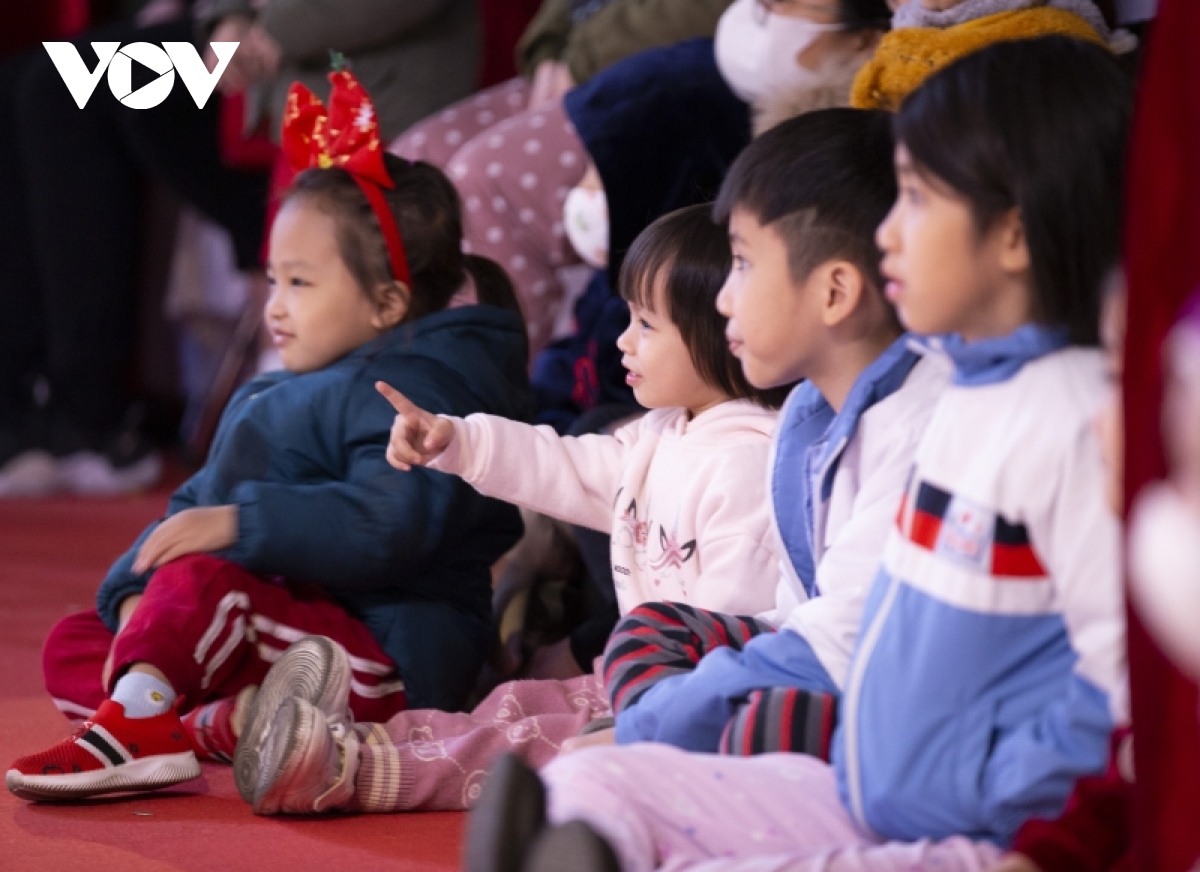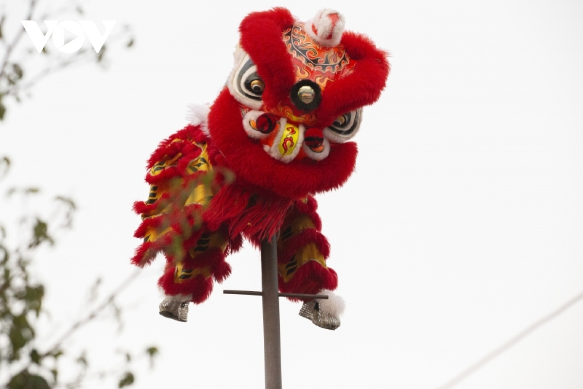 Các em nhỏ thích thú khi được xem những con lân nhào lộn, nhảy trên bục cao. |