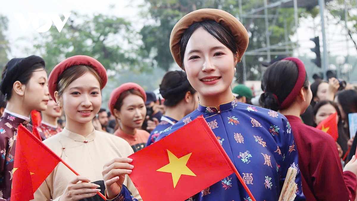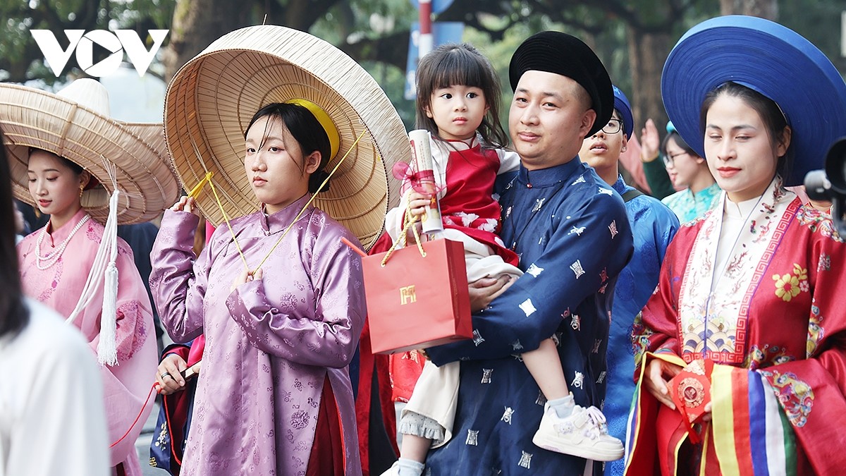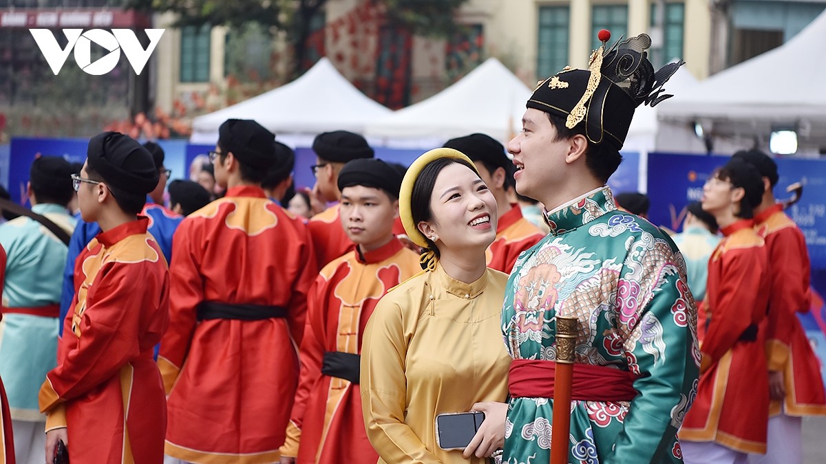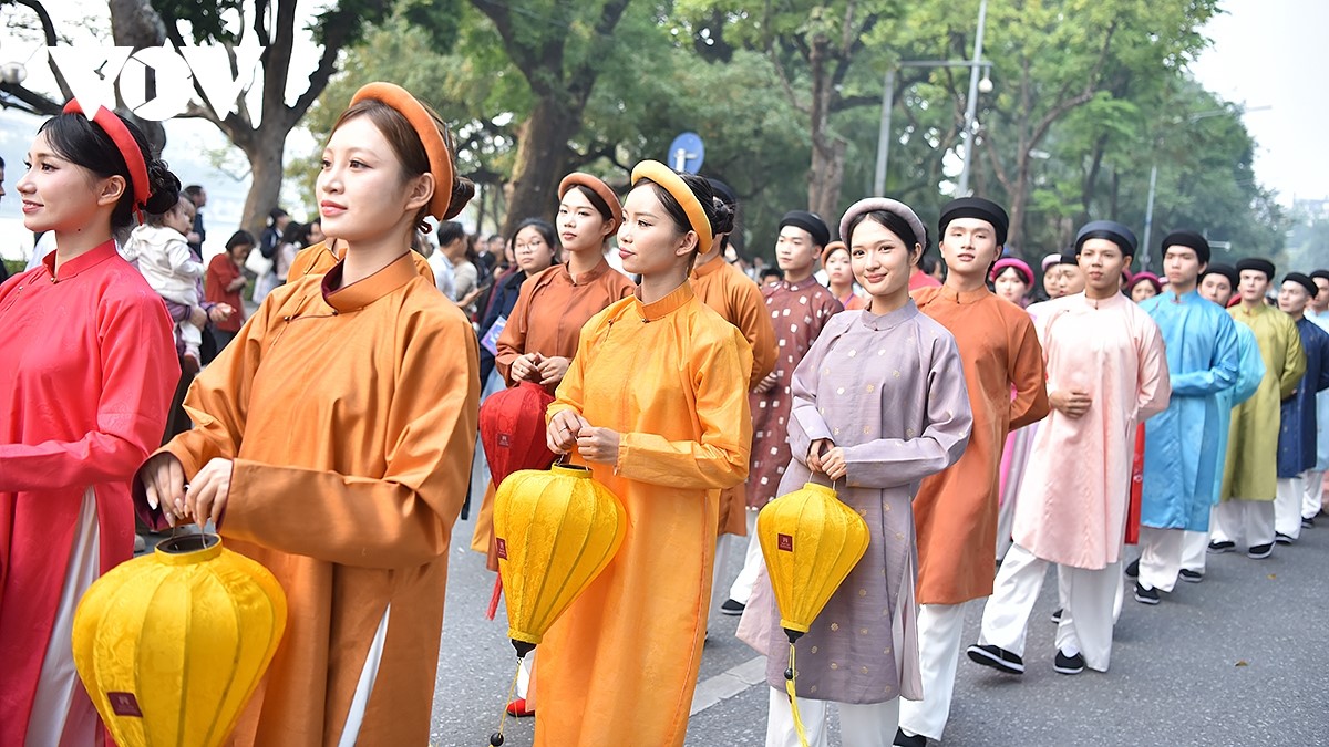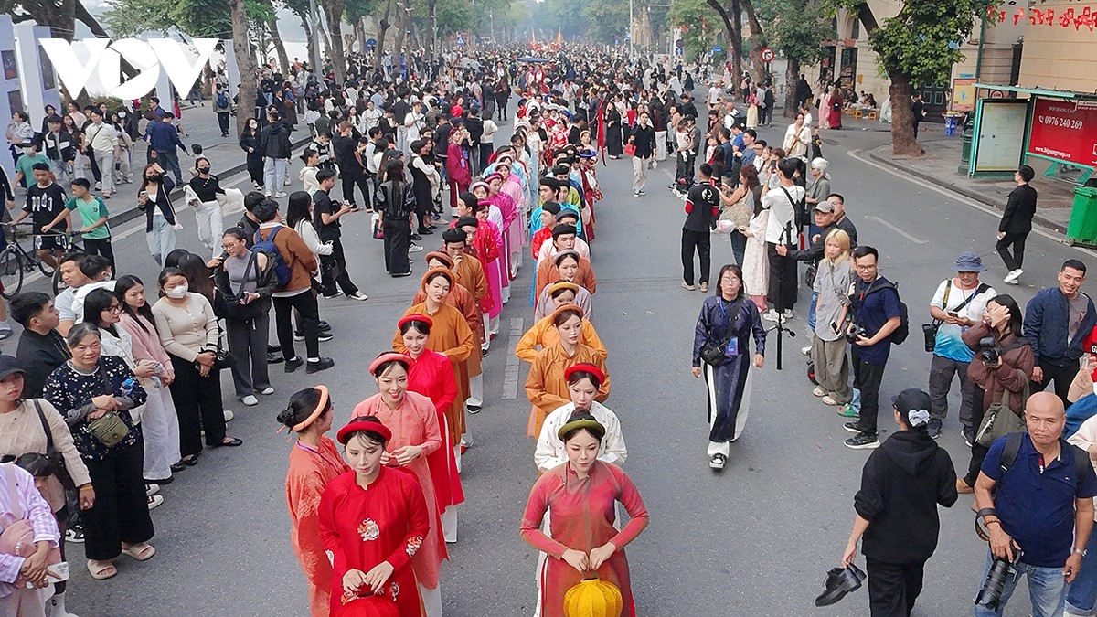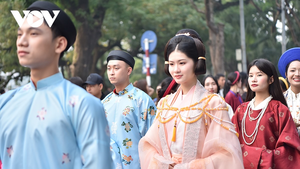 Dòng người trong áo dài, nhật bình, ngũ thân…tạo nên khung cảnh rực rỡ sắc màu, thu hút đông đảo người dân và du khách. |