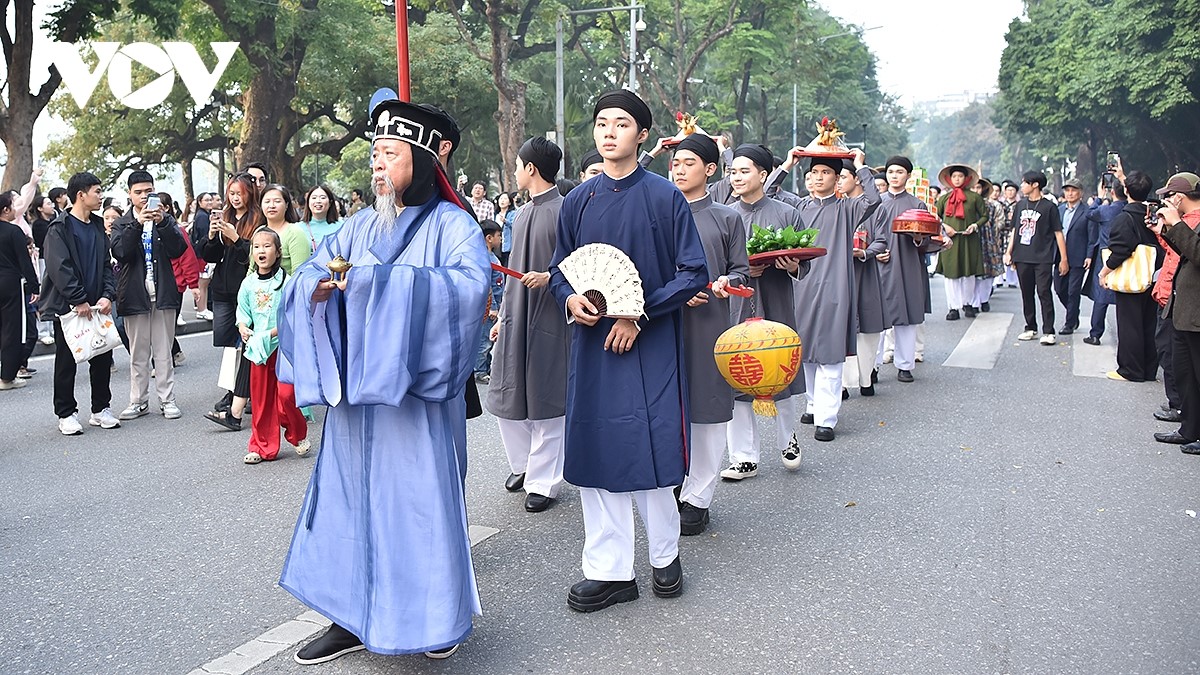 Người tham gia mang lễ phẩm trong không khí rộn ràng của đoàn rước dâu quanh hồ Hoàn Kiếm. |