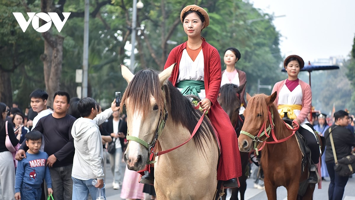 Đội hình nữ quan rực rỡ trong áo dài, nhật bình, ngũ thân… diễu hành trang nghiêm theo nghi thức truyền thống. |