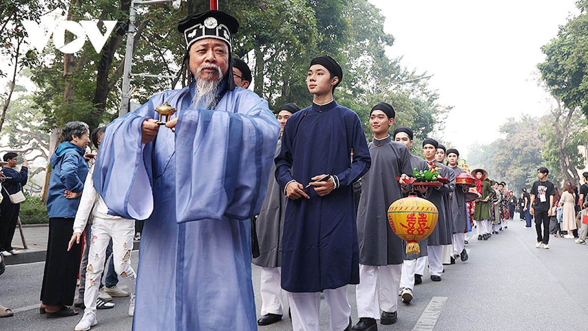 Các thành viên đoàn rước mang lễ phẩm hỷ sự di chuyển qua khu vực hồ Hoàn Kiếm, thu hút đông đảo người dân theo dõi. |