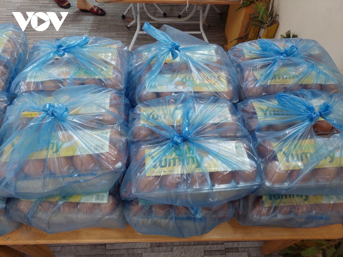 Mỗi phần quà gồm: 5 kg gạo Bắc Hương, 2 hộp trứng (20 quả), gia vị, mỳ Chũ...