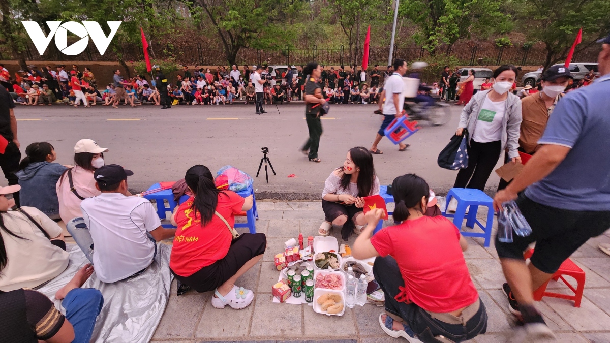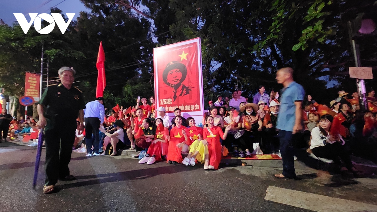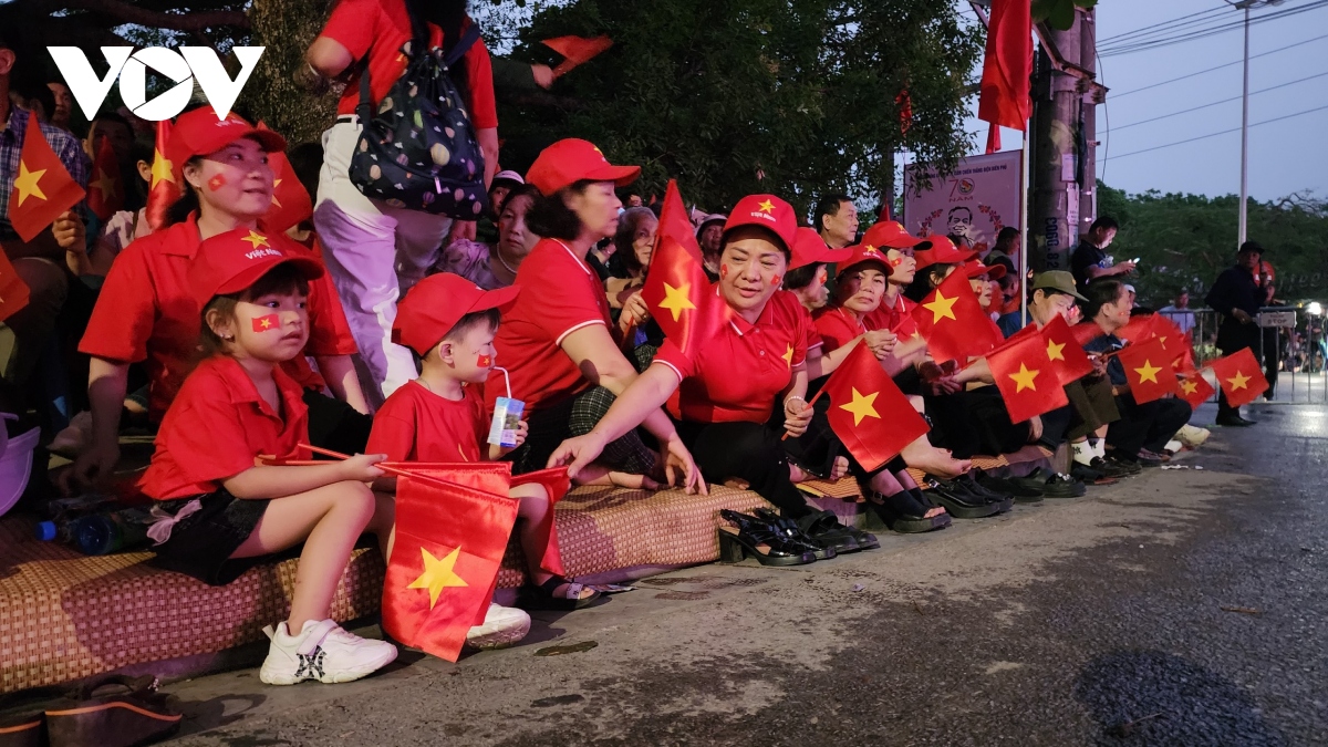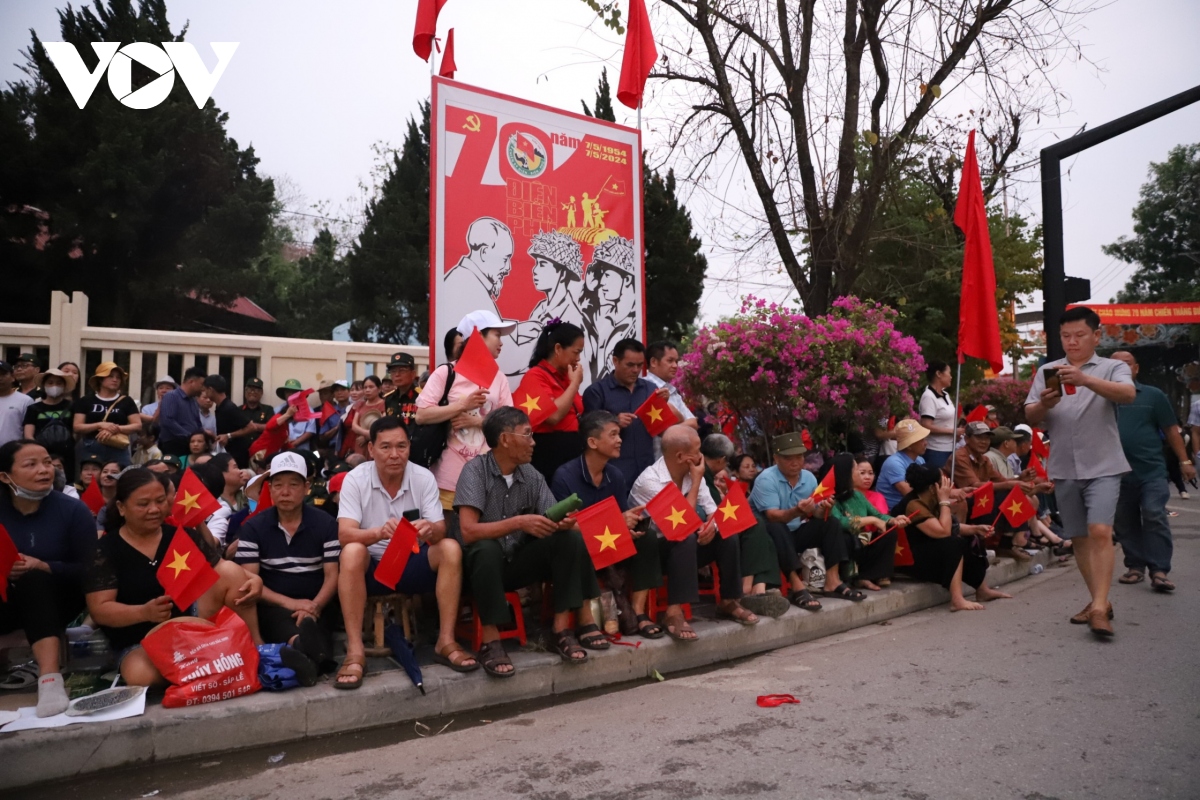 Bà con ngồi chật kín nhiều tuyến phố nơi có đoàn diễu binh, diễu hành mừng 70 năm Chiến thắng Điện Biên Phủ đi qua từ tờ mờ sáng. |