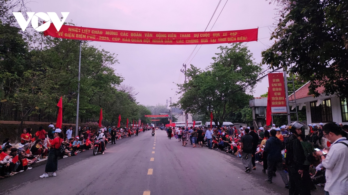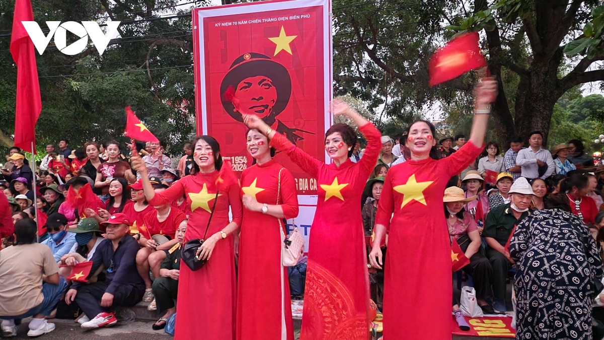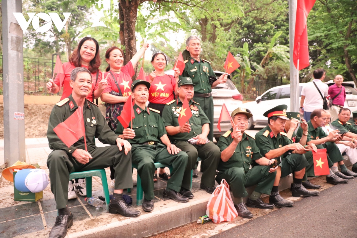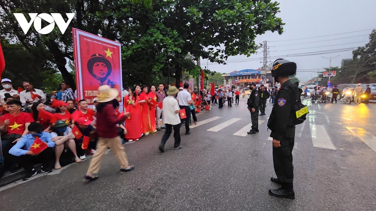 Bà con ngồi chật kín nhiều tuyến phố nơi có đoàn diễu binh, diễu hành mừng 70 năm Chiến thắng Điện Biên Phủ đi qua từ tờ mờ sáng. |