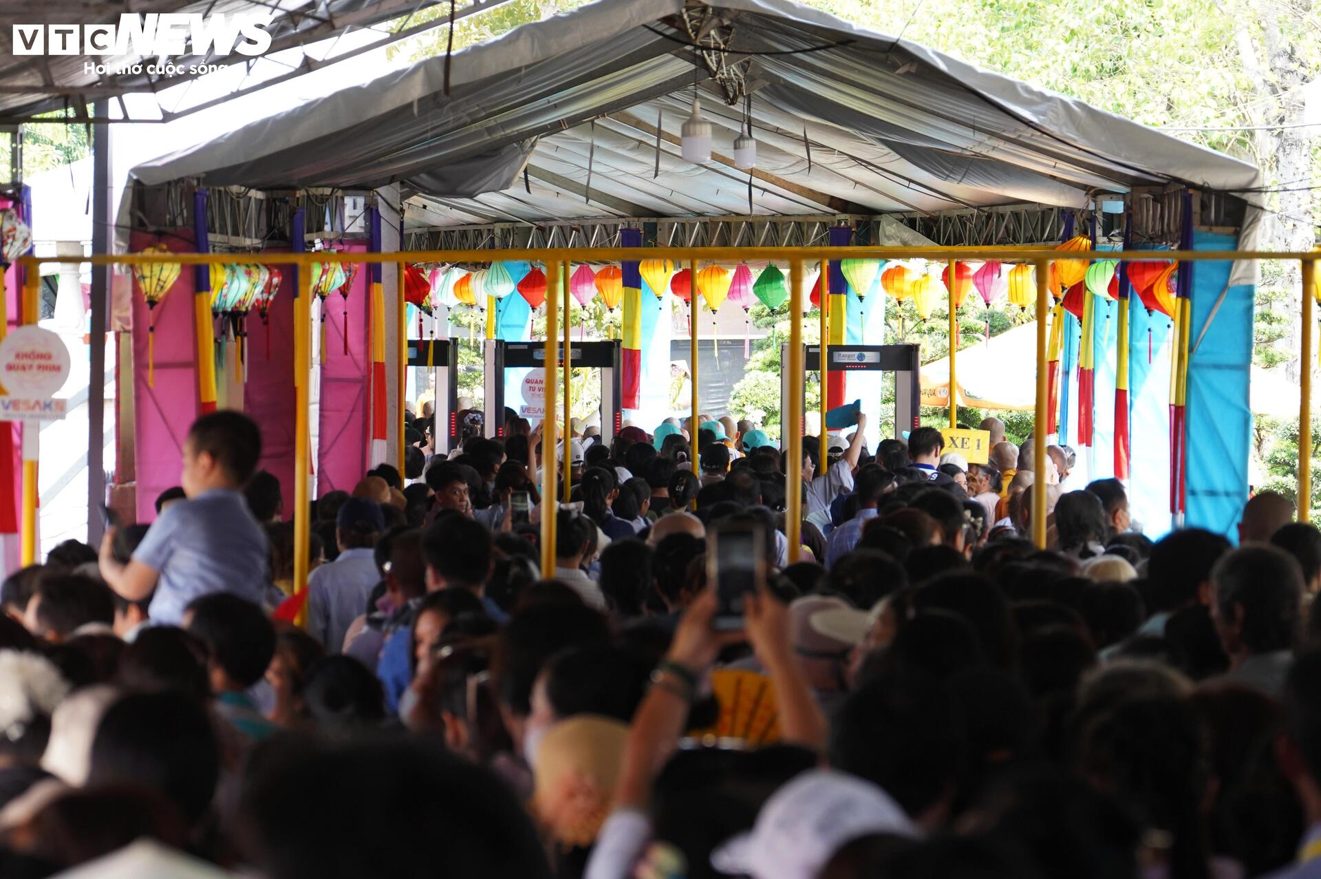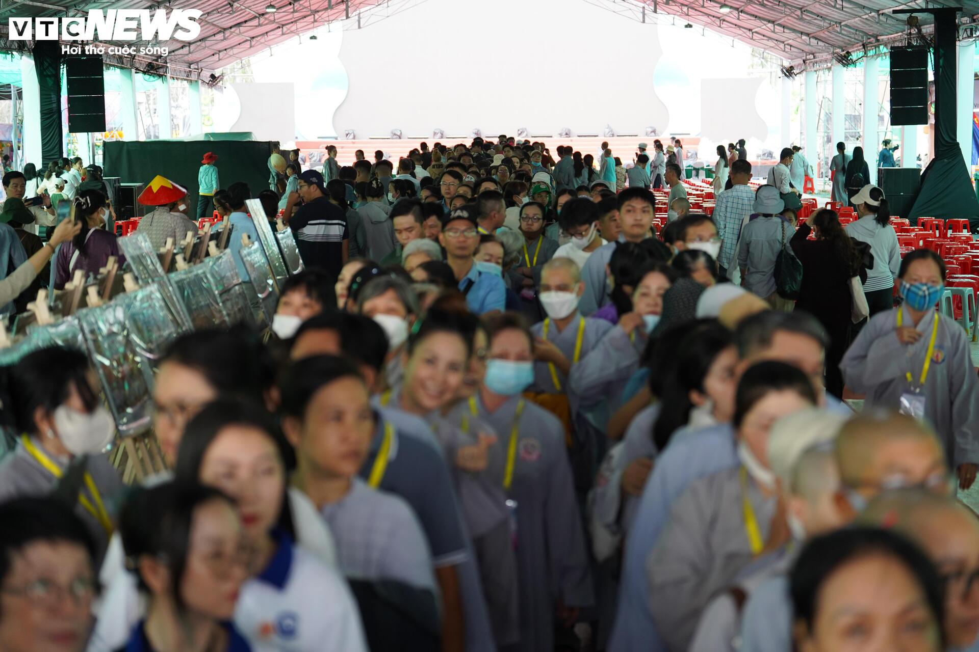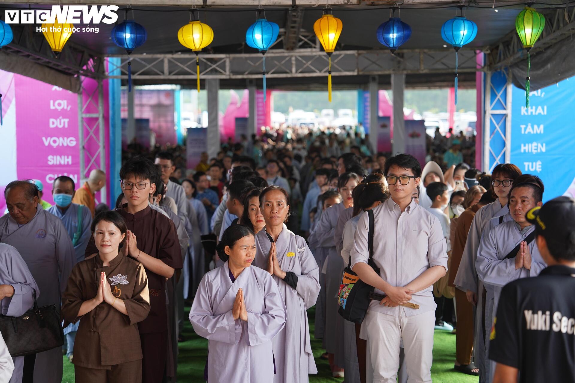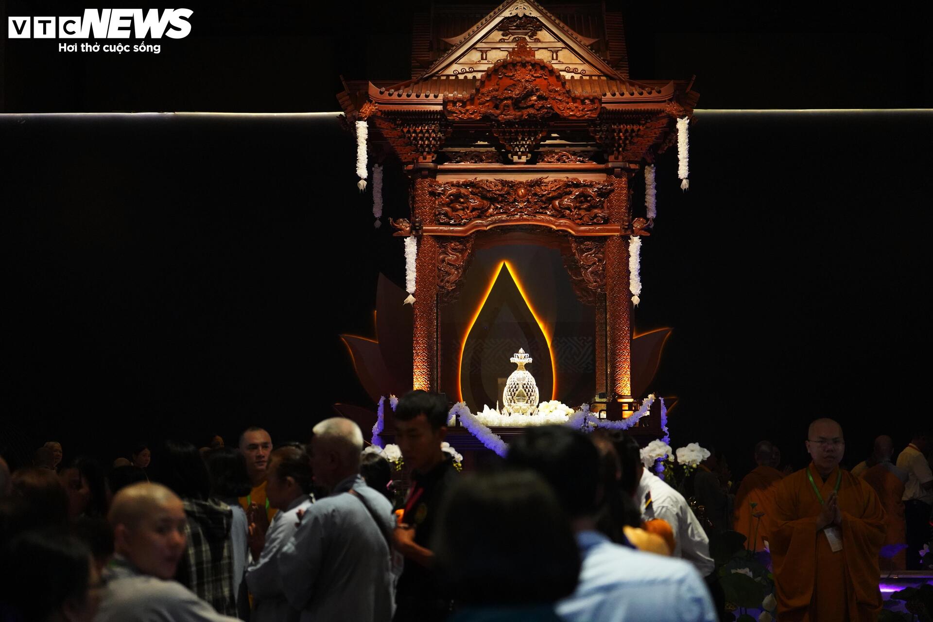 | Dòng người trải dài từ cổng vào đến khu chính điện, tay chắp trước ngực, ánh mắt thành kính hướng về khám thờ xá lợi. |