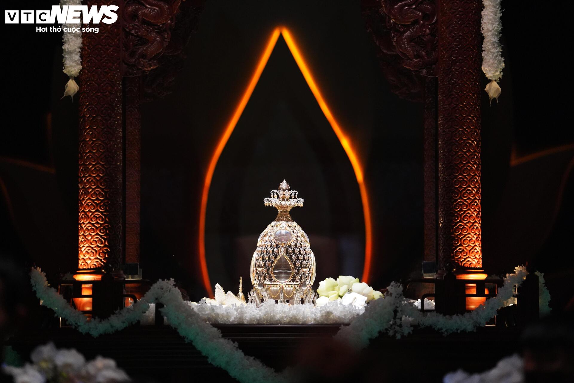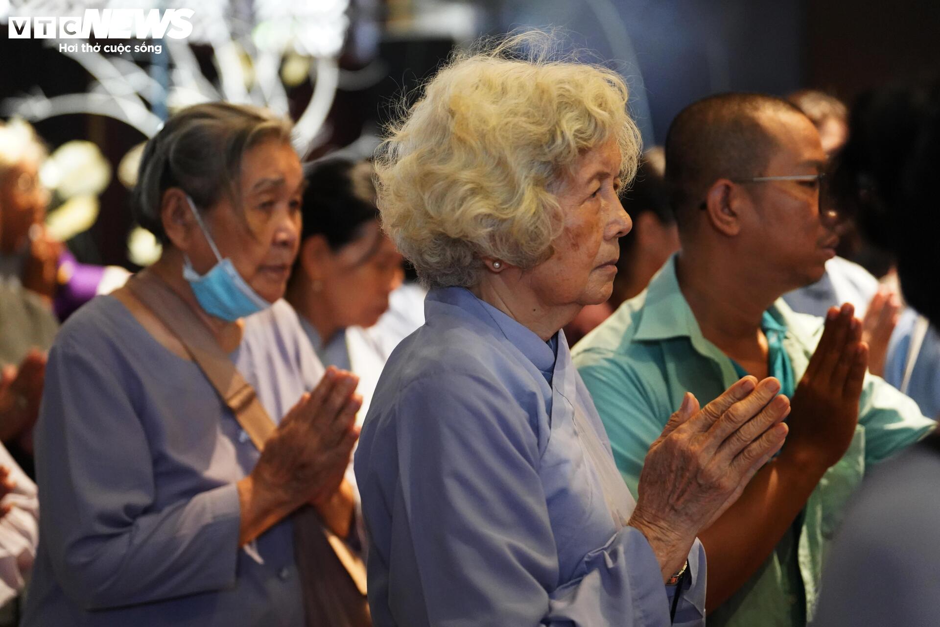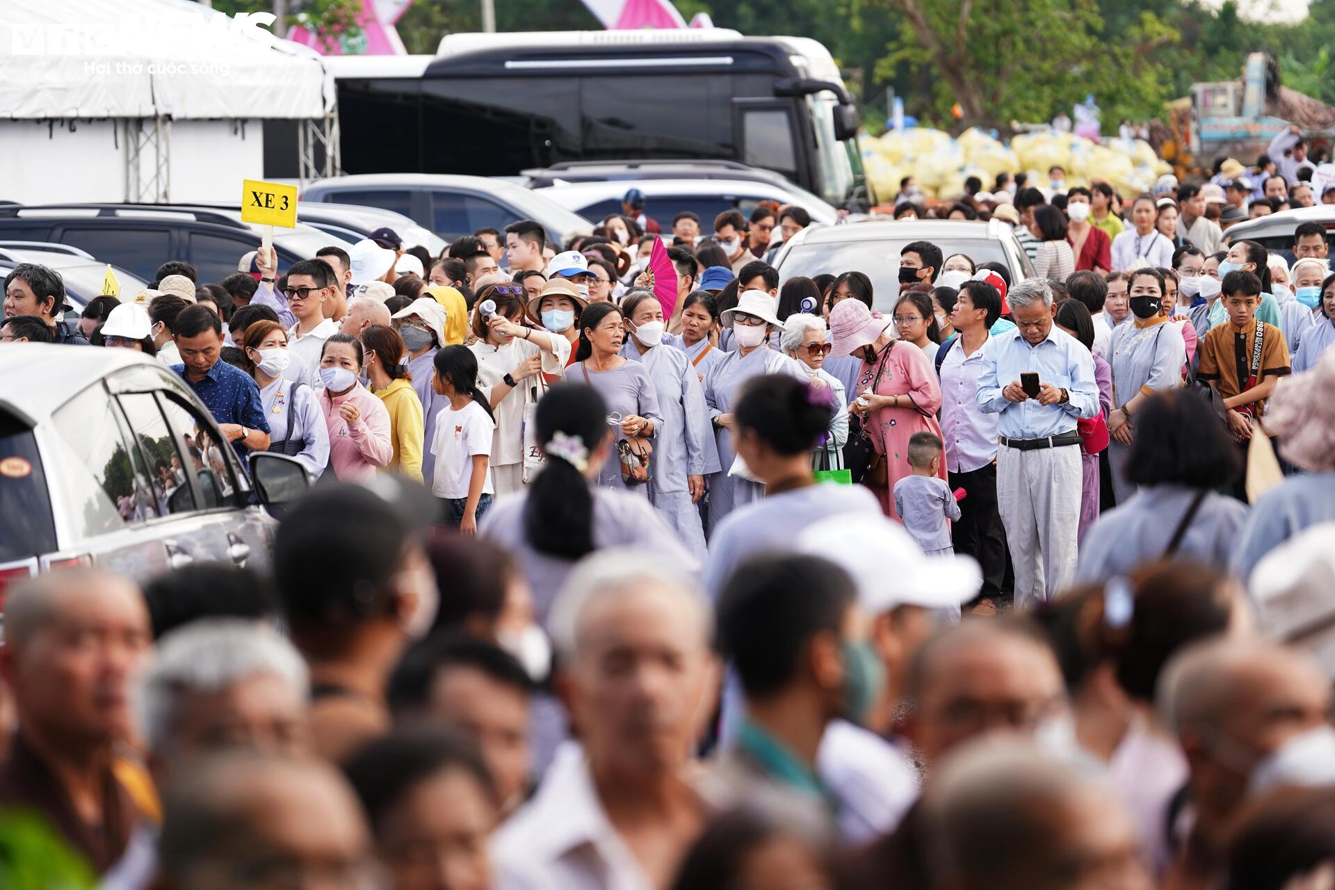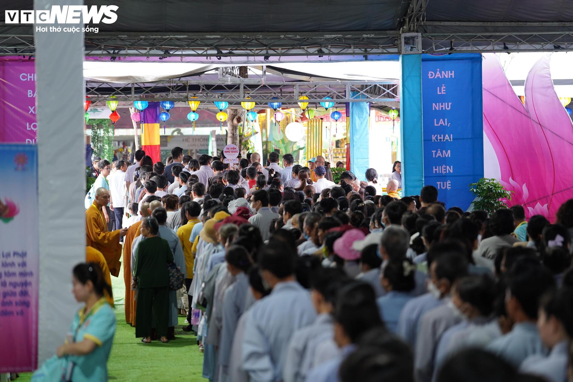 | Dòng người trải dài từ cổng vào đến khu chính điện, tay chắp trước ngực, ánh mắt thành kính hướng về khám thờ xá lợi. |
