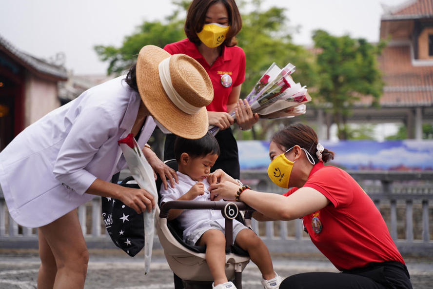 Một em bé được tặng huy hiệu tại Sun World Ba Na Hills vào ngày 18/3/2022 khi khu du lịch lớn nhất miền Trung này chính thức mở cửa đón khách trở lại sau gần một năm đóng cửa phòng dịch COVID-19. Ảnh: Đức Hoàng/ toquoc.vn |