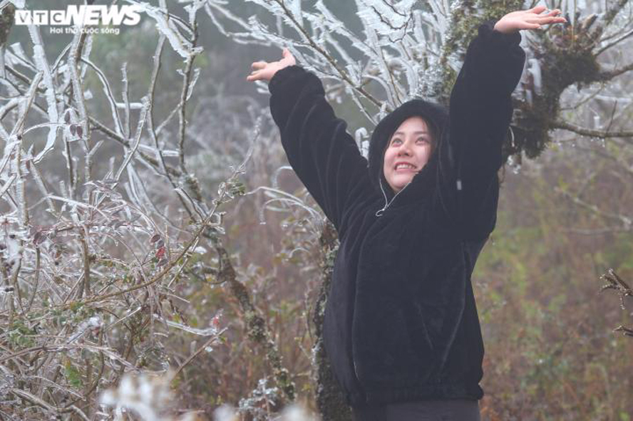 Người dân phấn khích tạo dáng chụp ảnh cùng băng giá tại Lào Cai dưới cái rét âm độ C vào những ngày cuối tháng 2/2022. Ảnh: VTCNews |