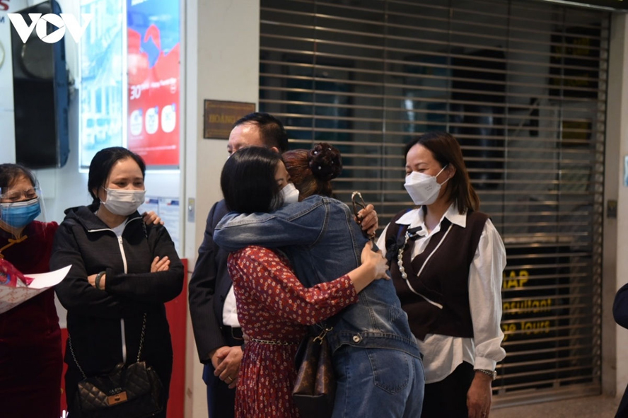 Niềm vui gặp lại người thân trở về từ vùng chiến sự Ukraine tại sân bay Nội Bài sáng 8/3/2022. Ảnh: VOV |