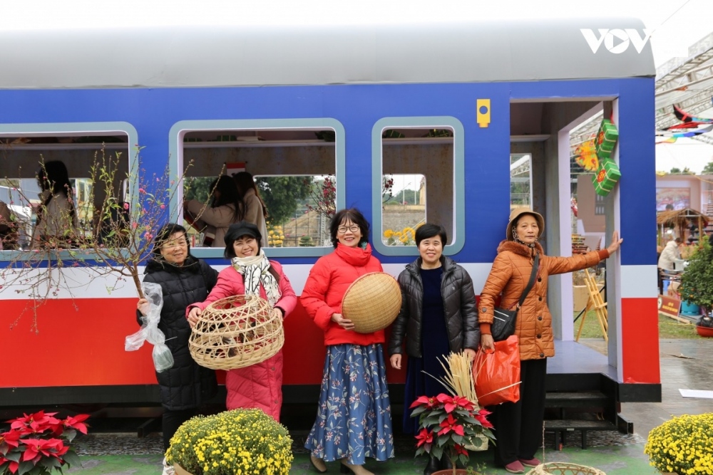 Du khách khám phá không gian "Chuyến tàu quê hương", đưa những người con xa quê về quê ăn Tết. |