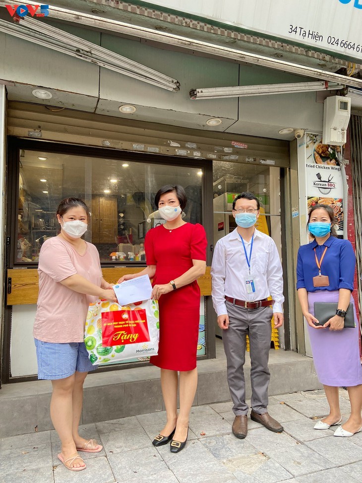 Đoàn đến thăm hỏi, tặng quà bà Won Yumi, quốc tịch Hàn Quốc đang bán hàng ẩm thực tại 76 Hàng Bạc. |