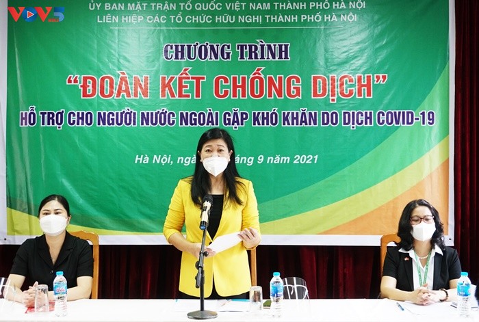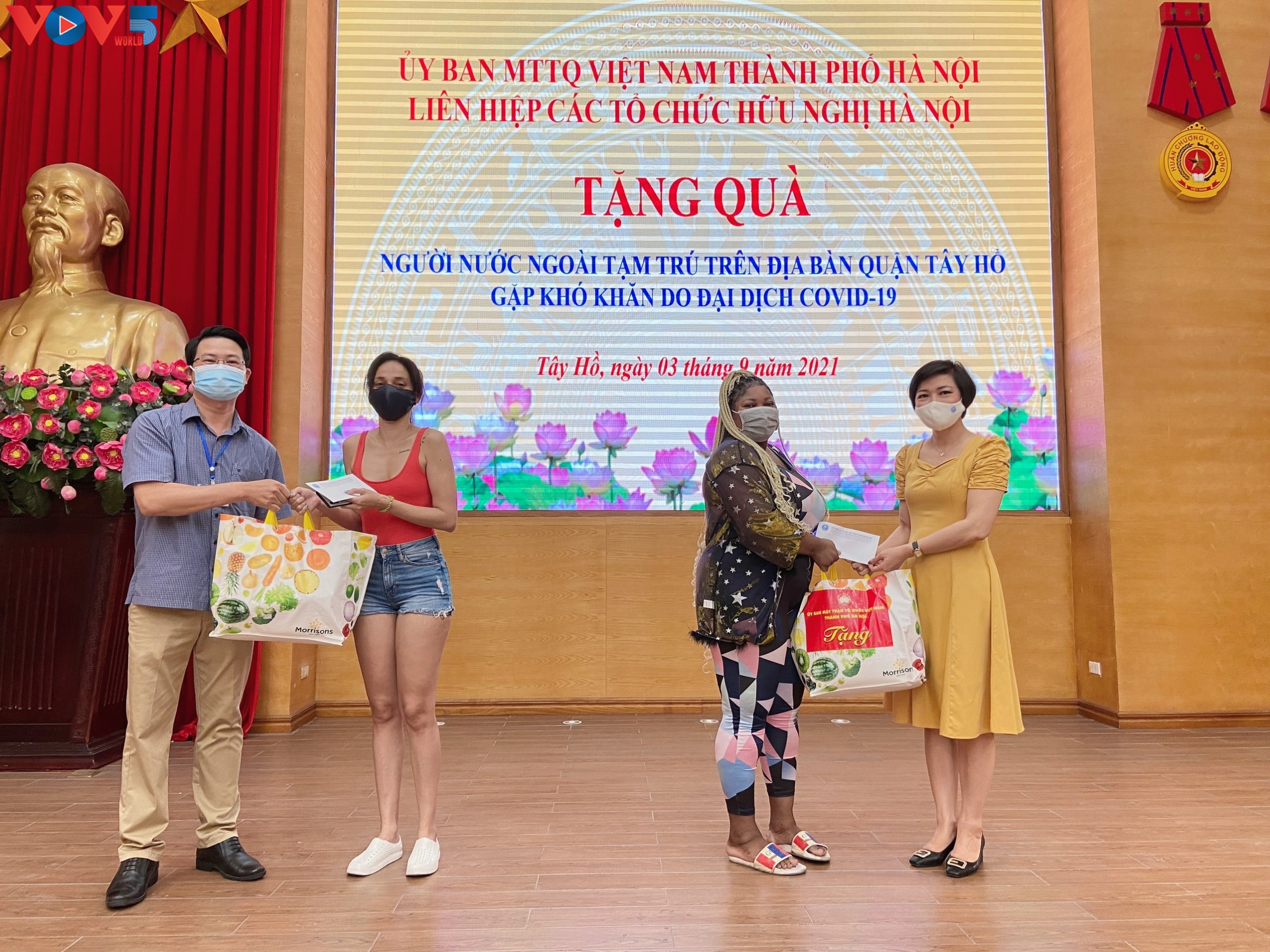 Bà Nguyễn Lan Hương (áo vàng), Ủy viên Ban Thường vụ Thành ủy, Chủ tịch Ủy ban Mặt trận Tổ quốc Việt Nam thành phố Hà Nội, Chủ tịch Liên hiệp các tổ chức hữu nghị thành phố Hà Nội cho biết: "Việc hỗ trợ các em sinh viên nước ngoài đang sinh sống và học tập trên địa bản Thủ đô giúp các em yên tâm sinh hoạt, học tập, đồng lòng cùng nhân dân Thủ đô trong công tác phòng chống dịch. Món quà tuy nhỏ nhưng là nguồn động viên tinh thần lớn cho các em và thể hiện tình cảm của người dân Thủ đô, người Việt Nam với các em sinh viên nước ngoài nói riêng, bạn bè quốc tế nói chung. Chúng tôi hy vọng với sự quyết tâm của chính quyền thành phố, sự vào cuộc của hệ thống chính trị, và sự đồng lòng của người dân, sự ủng hộ của các em sinh viên nước ngoài và bạn bè quốc tế, Hà Nội sẽ sớm khống chế được dịch bệnh để cuộc sống trở lại bình thường".