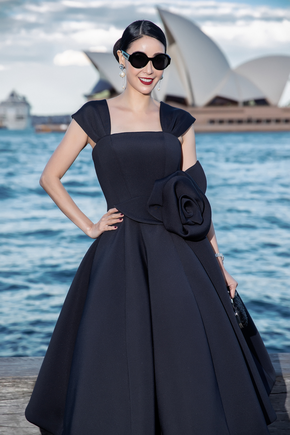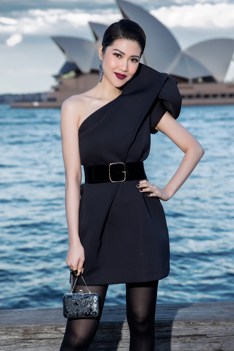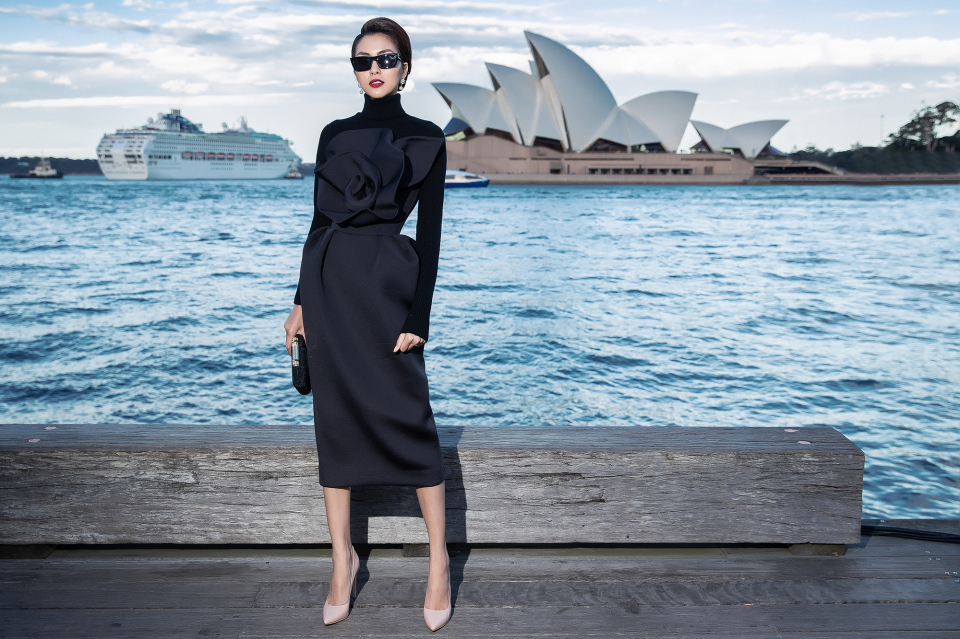 Nữ diễn viên Tăng Thanh Hà mang đến vẻ ngoài sang trọng khi kết hợp một thiết kế cúp ngực ôm sát với áo cổ lọ bên trong để phù hợp với tiết trời đang trở lạnh của Sydney. |