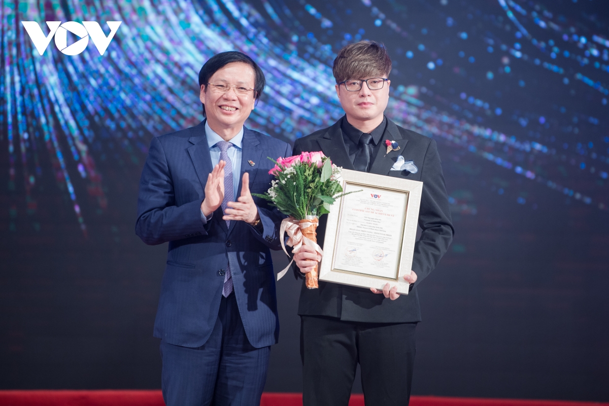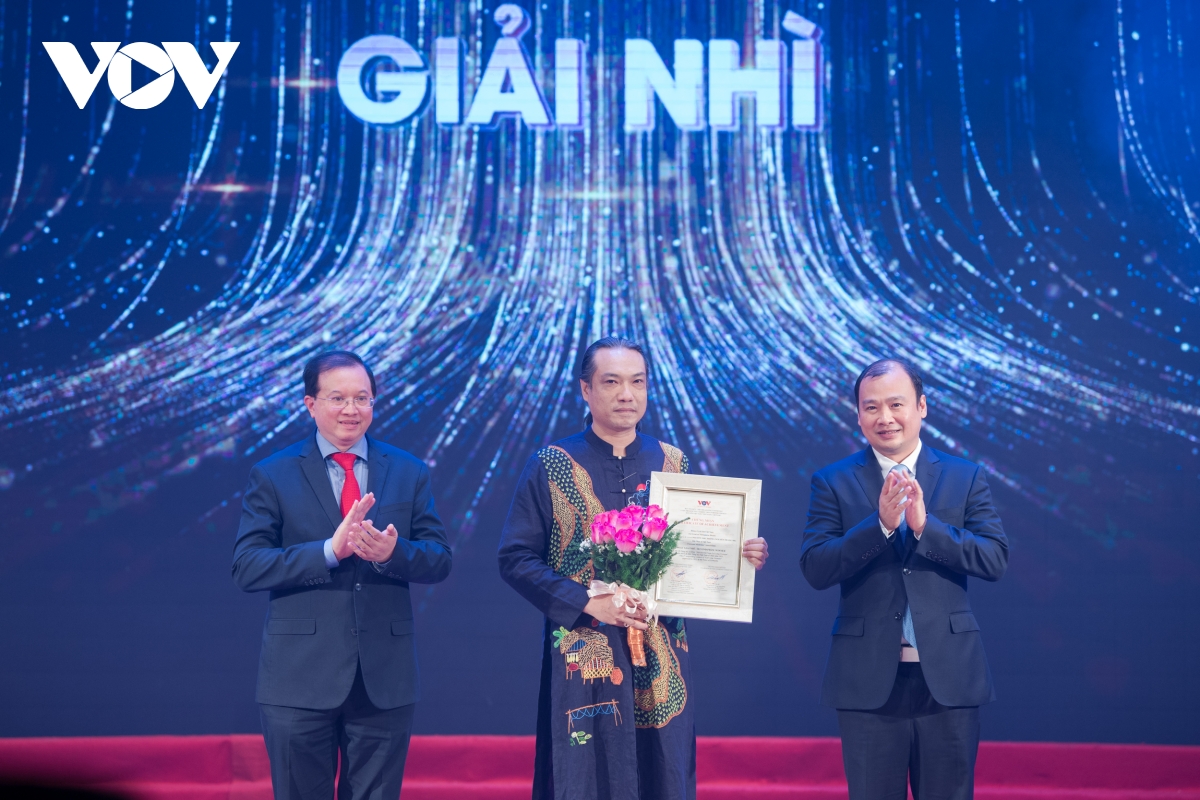 Tổng Giám đốc VOV Đỗ Tiến Sỹ (bên phải) và PGS.TS - Nhạc sĩ Đỗ Hồng Quân (thứ 2 bên trái) trao Giải Nhất cho nhạc sĩ Tuấn Phương và nhà thơ Lê Tự Minh với ca khúc "Quê hương Việt Nam tôi".