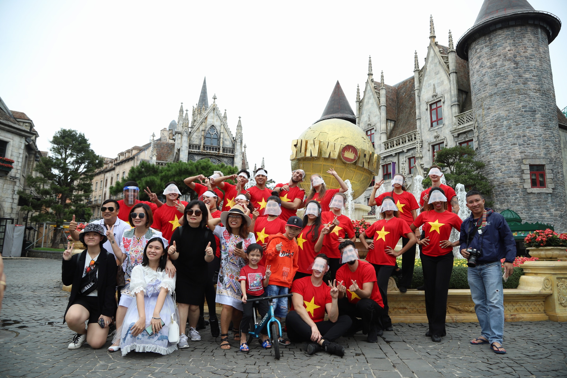 Những vị khách đầu tiên “xông đất Bà Nà” sau giãn cách xã hội cũng vô cùng bất ngờ trước sự đón chào độc đáo mà khu du lịch dành tặng họ. Các nghệ sỹ, nhân viên của Bà Nà Hills đều mặc áo cờ đỏ sao vàng để đón khách. Những chiếc kính chống giọt bắn giống như một đạo cụ biểu diễn hết sức ngộ nghĩnh. Du lịch an toàn là thông điệp mà các nghệ sỹ, nhân viên Bà Nà muốn gửi gắm đến du khách ngay từ khi họ đặt chân đến miền tiên cảnh.