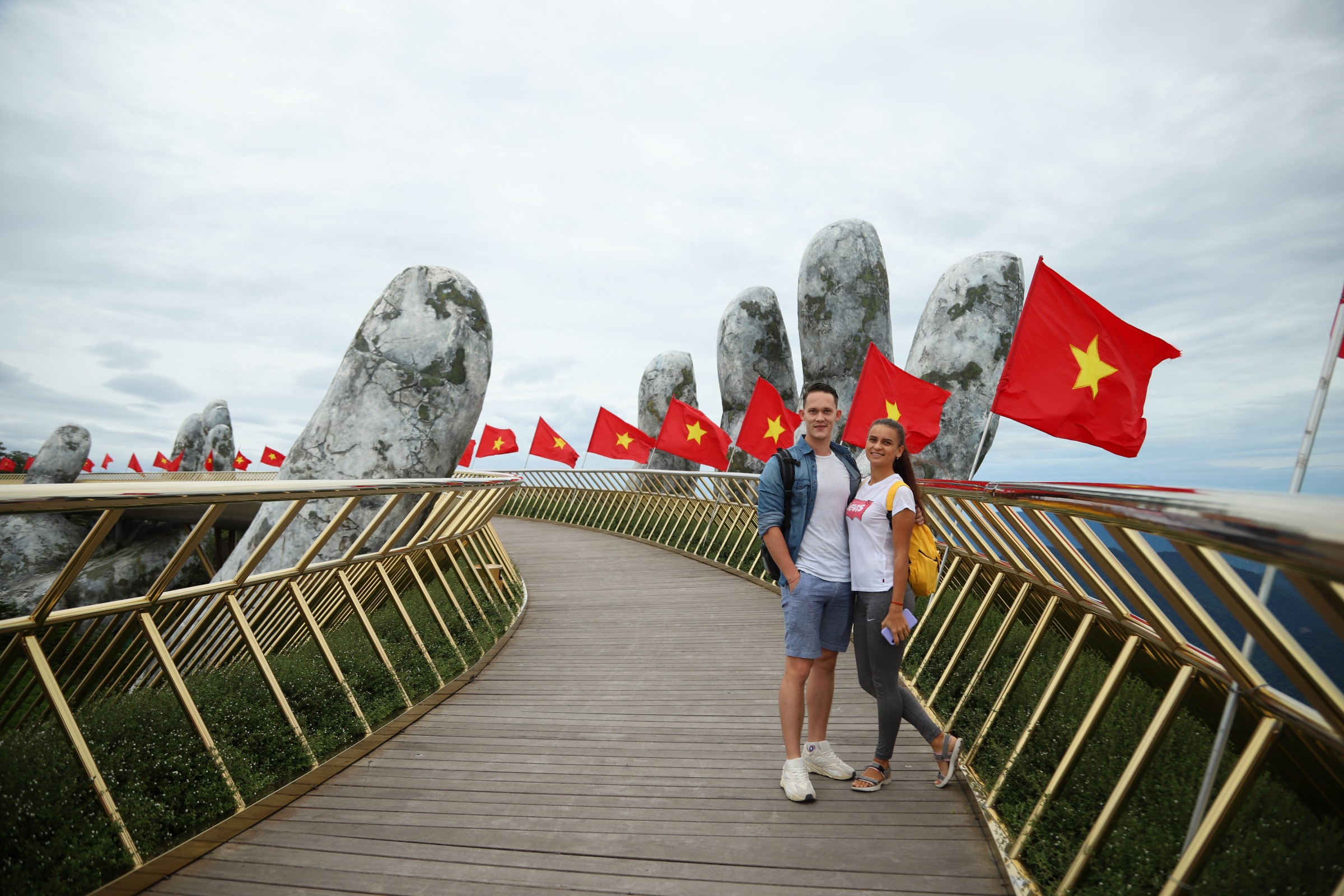 Rất nhiều du khách ấn tượng với hình ảnh cây Cầu Vàng rực rỡ cờ đỏ sao vàng tung bay. Andrew- một chuyên gia người Anh cho biết, anh sẽ gửi tấm hình chụp với bạn gái về cho người thân trong gia đình, với lời nhắn nhủ: “Việt Nam an toàn, Bà Nà vô cùng tuyệt vời”. |