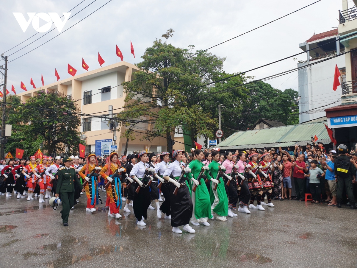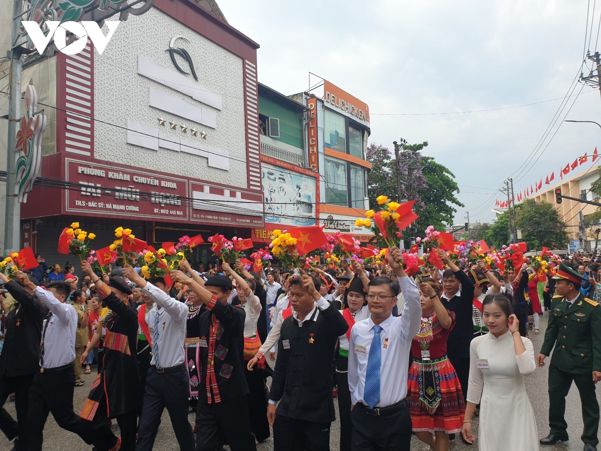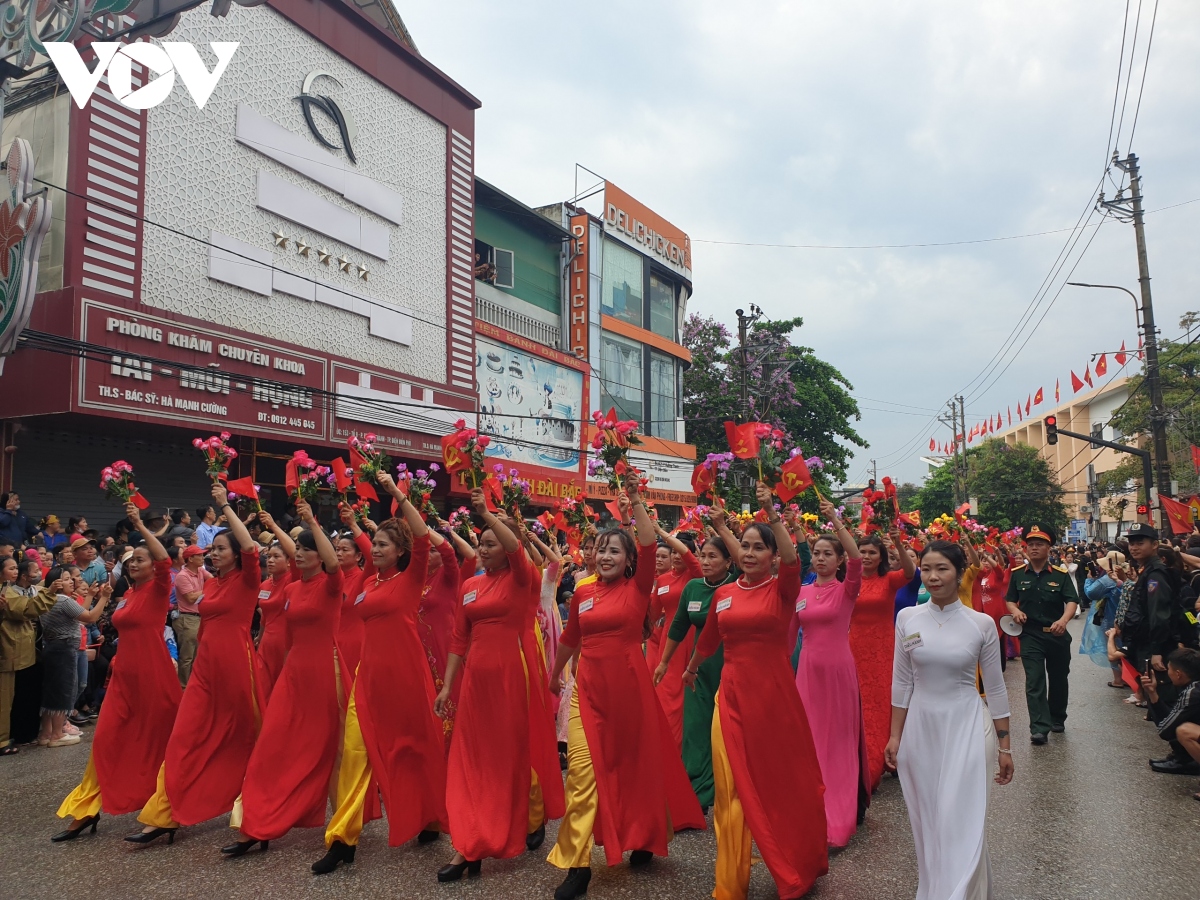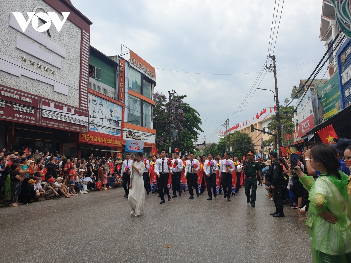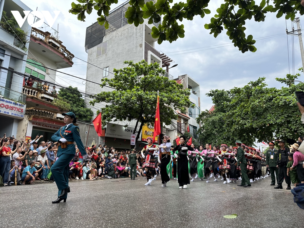 Các khối diễu binh, diễu hành qua các tuyến phố với sự chào đón nồng nhiệt của người dân, du khách tại thành phố Điện Biên Phủ. |
