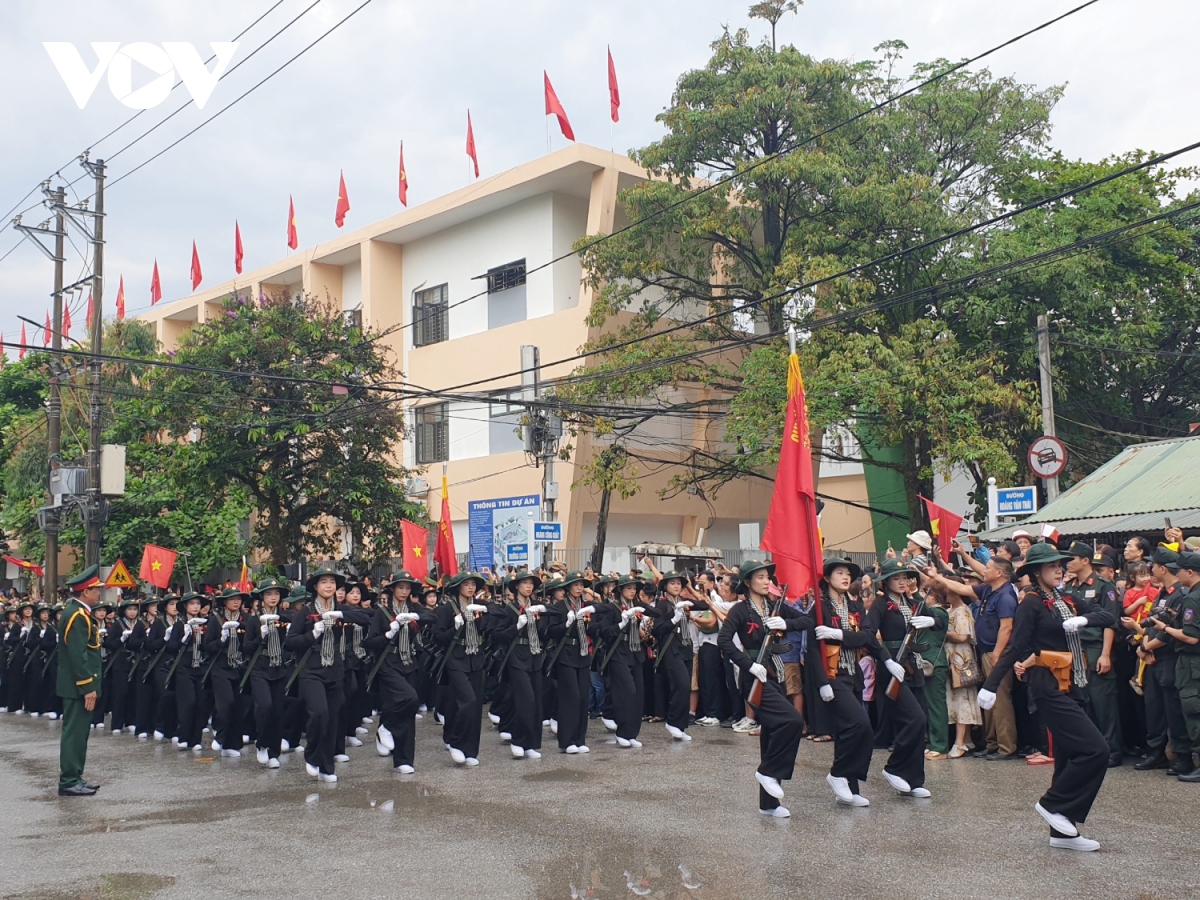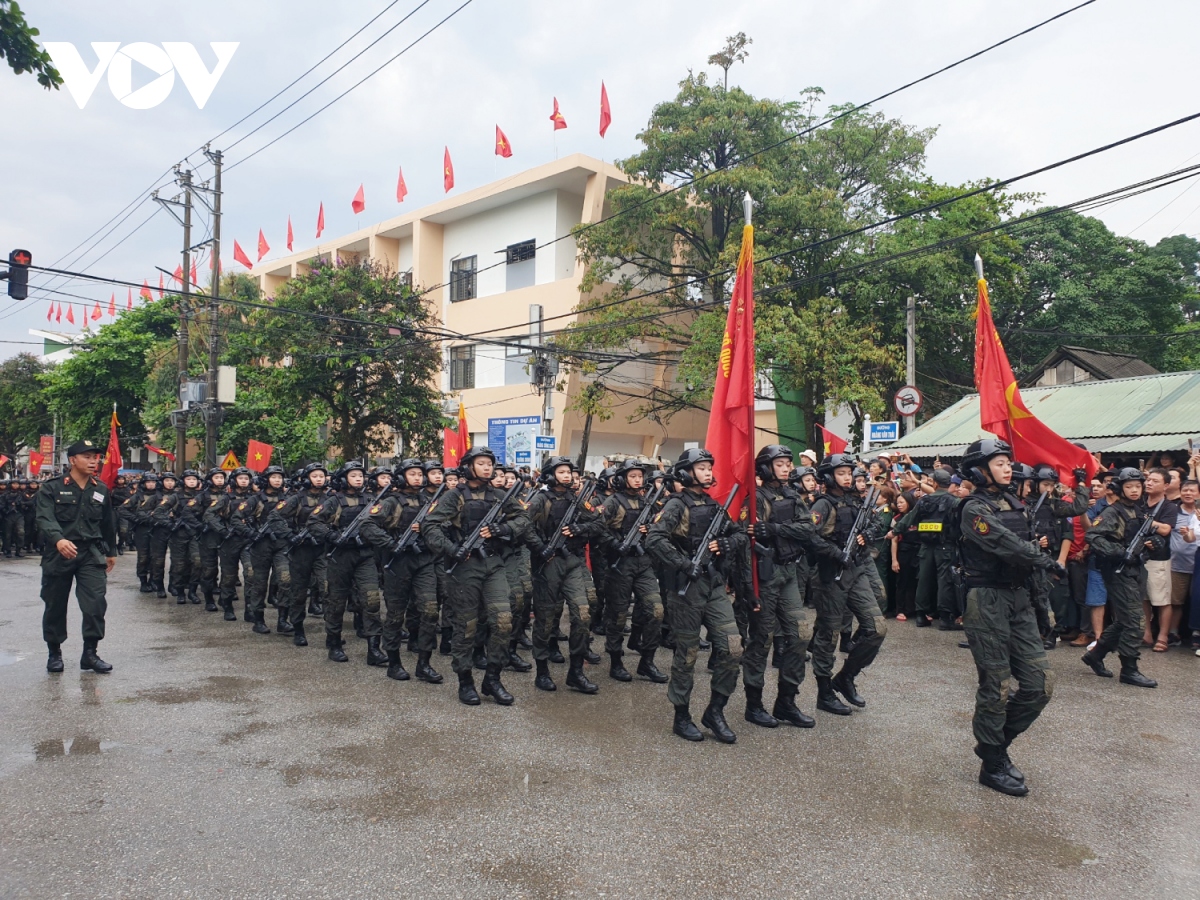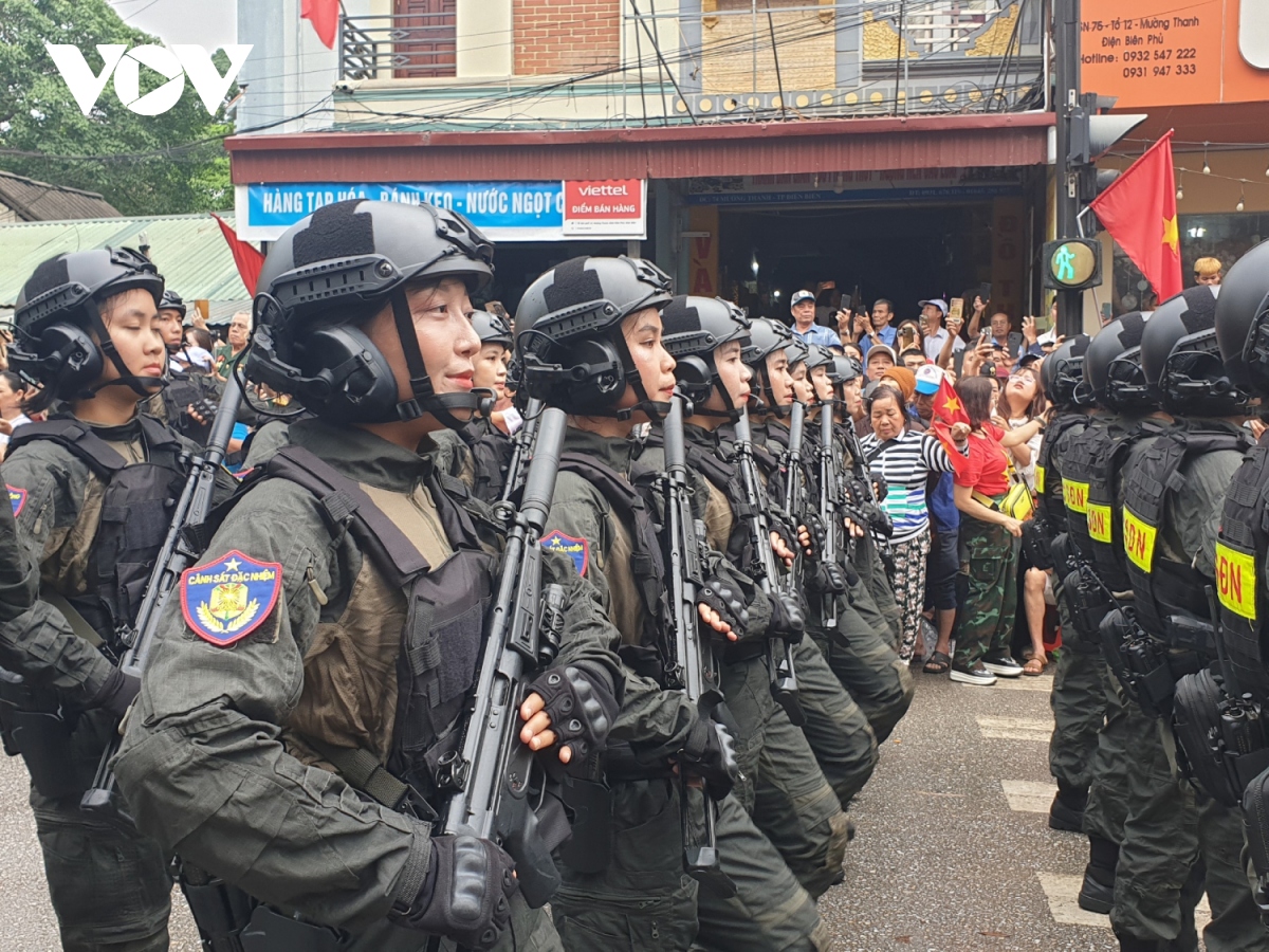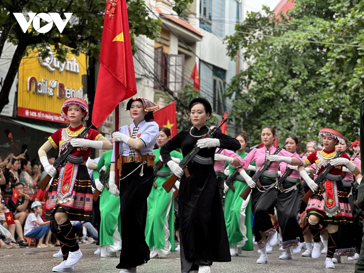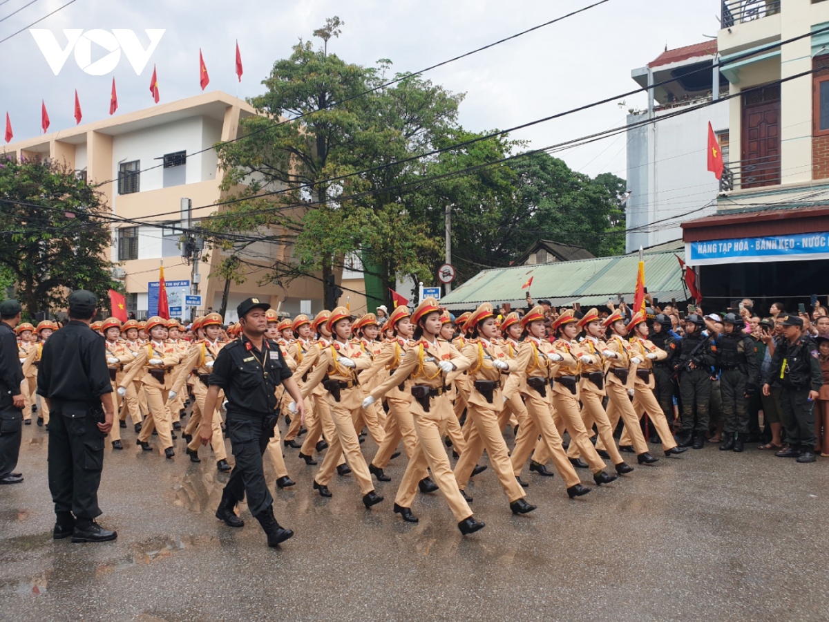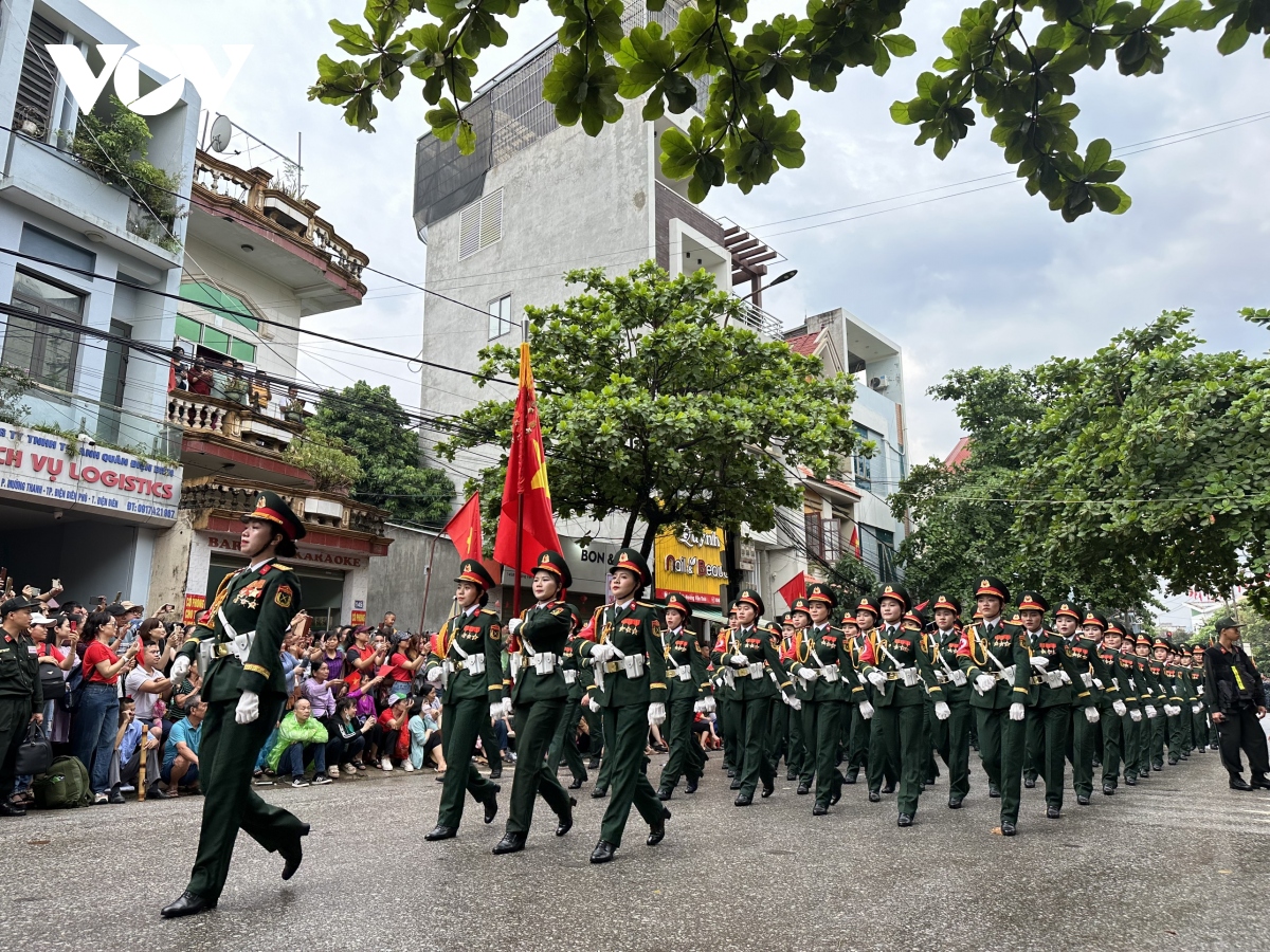 Các khối diễu binh, diễu hành qua các tuyến phố với sự chào đón nồng nhiệt của người dân, du khách tại thành phố Điện Biên Phủ. |