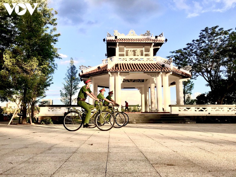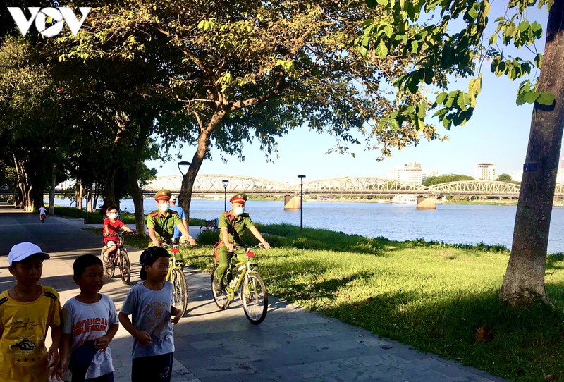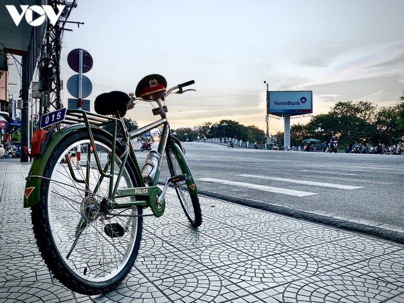 | Hình ảnh những chiến sĩ công an trên chiếc xe đạp màu xanh dần trở thành quen thuộc trên các tuyến đường Huế. |